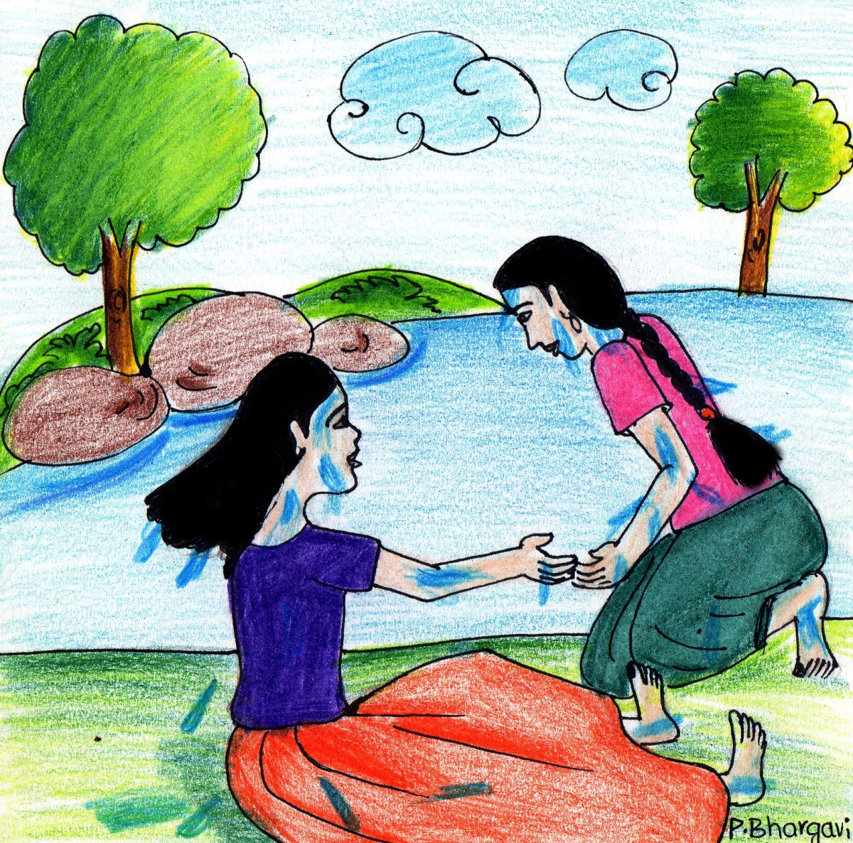 ఒక్కరొక్కరుగా అందరూ స్నానానికి దిగారు. ప్రియ మాత్రం అందరినీ చూస్తూ గట్టు మీదనే ఉండిపోయింది.