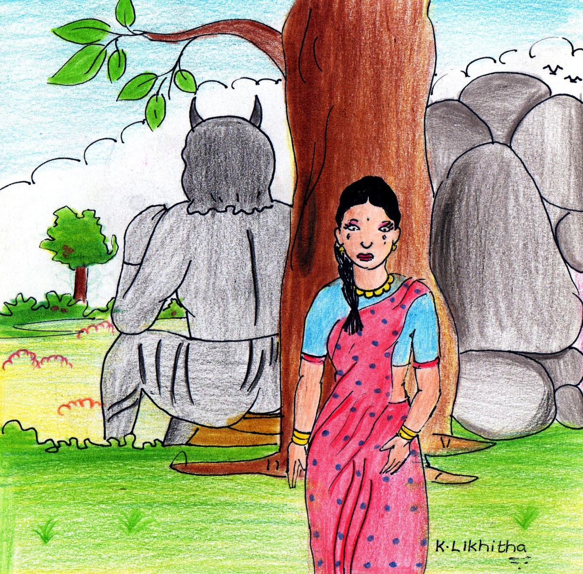ఏంటా అని చూస్తే రాక్షసుడు! వాడు వసుంధరను ఒక్క చేత్తోటే ఒడిసి పట్టుకొని తన గుహవైపుకు నడవసాగాడు! వసుంధర ఎంత పెనుగులాడితే మటుకు, ఏం ప్రయోజనం?! వాడికున్న బలం ముందు తన శక్తి ఎందుకూ పనికిరాలేదు!