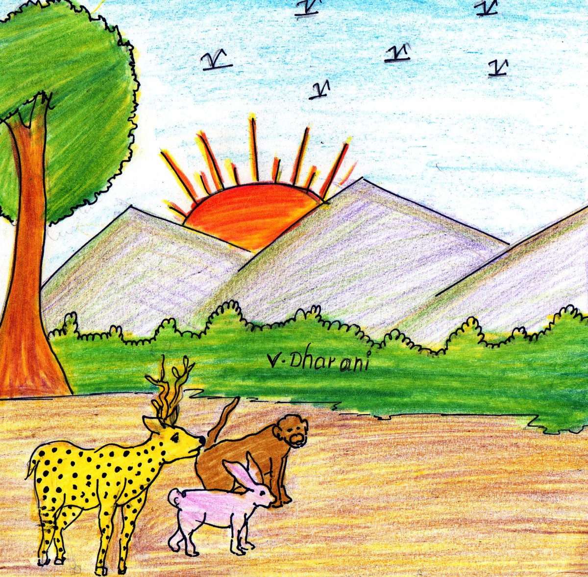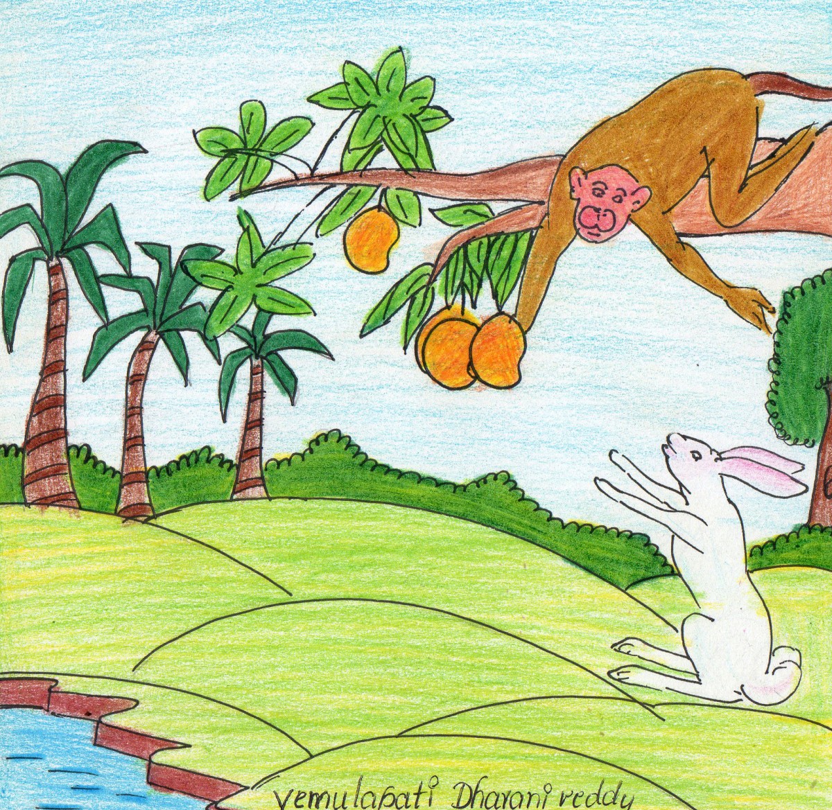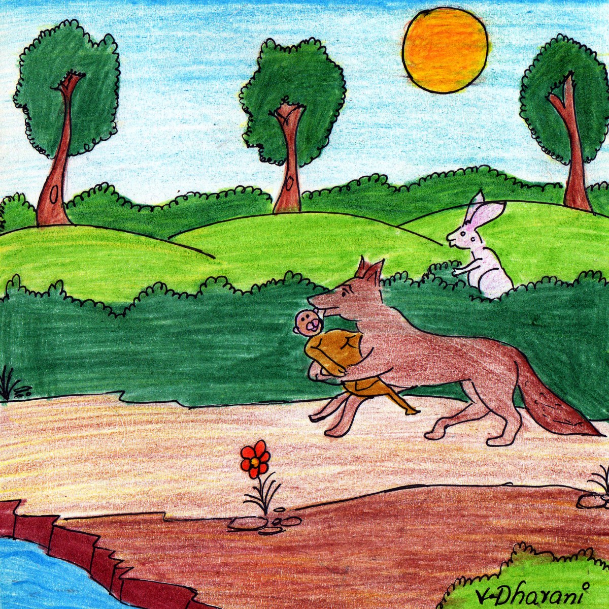 అటువైపుగానే కాస్త దూరాన తలవంచుకొని పోతున్నాయి కుందేలు, దాని మిత్రుడు జింకా. అవి చూసాయి, తోడేలు కోతిని ఎత్తుకుపోవడం.