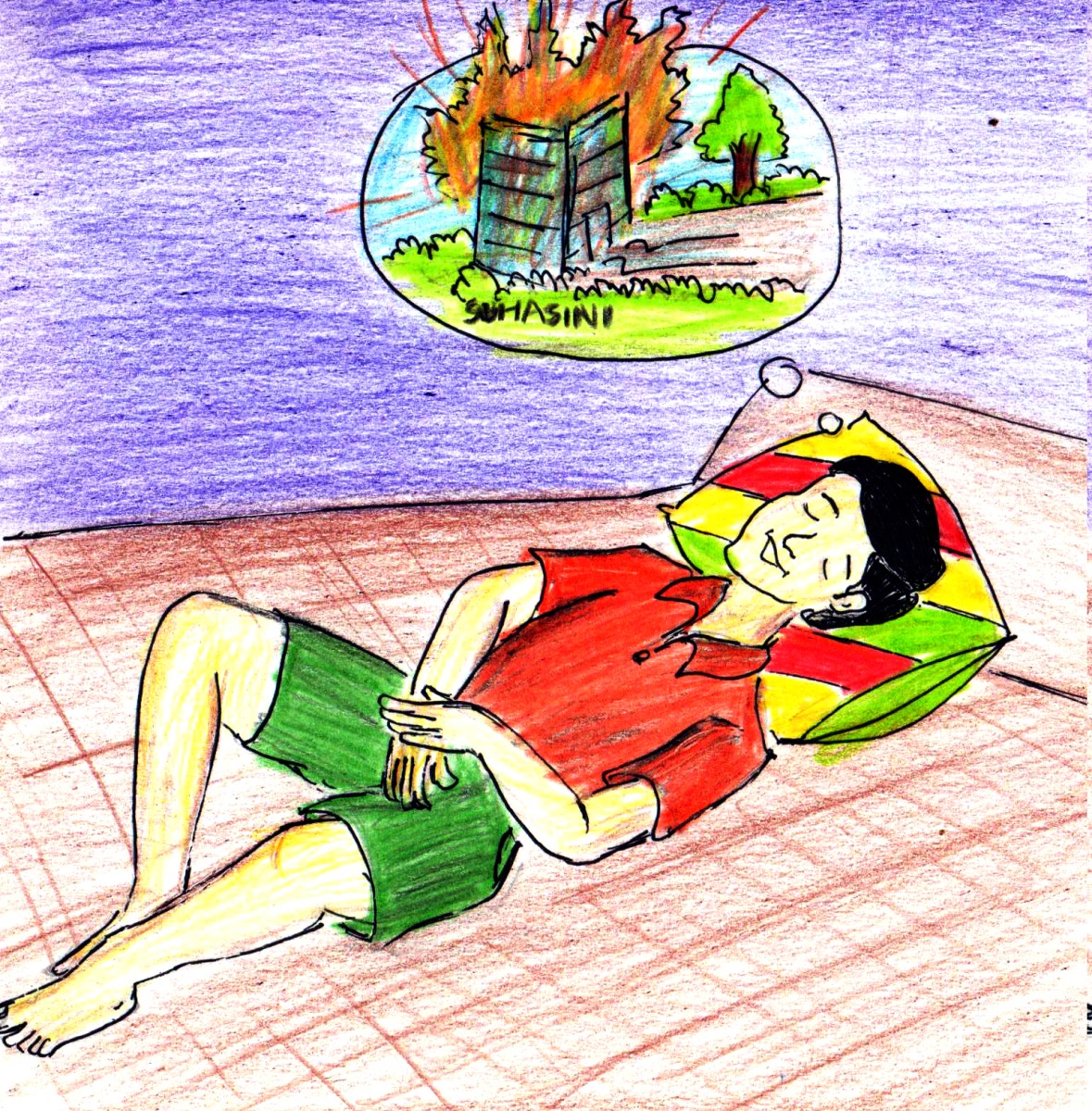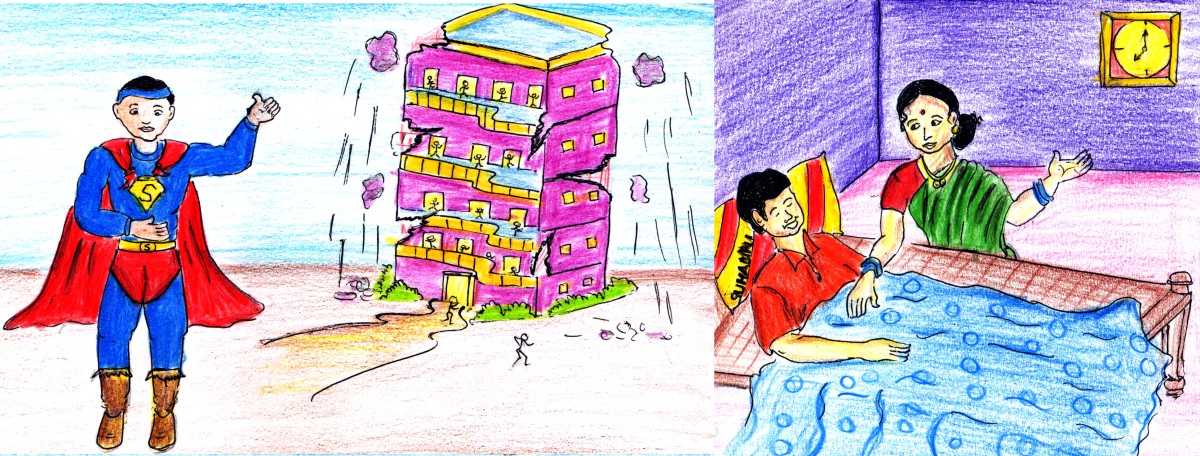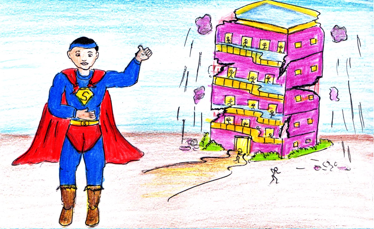 మళ్ళీ నేను ధైర్యం తెచ్చుకున్నాను. క్రుంగిపోతున్న భాగాన్ని నా చేతులతో పట్టుకొని ఎత్తటం మొదలు పెట్టాను. అక్కడ చేరినవాళ్లంతా నన్ను ప్రోత్సహిస్తూ "సూపర్ హీరో! నువ్వు చెయ్యగలవు! నువ్వు వీళ్లందరినీ కాపాడగలవు" అని అరుస్తున్నారు. అట్లా నేను దాదాపు ఒక అరగంట పాటు ఆ భవంతిని నిలిపి ఉంచగలిగాను. అయితే ఆలోగా అందులో ఉన్న మనుషులందరూ బయటికి వచ్చేసారు. ఆ పైన నేను మెల్లగా భవంతిని వదిలి ఇవతలికి రాబోతున్నాను..