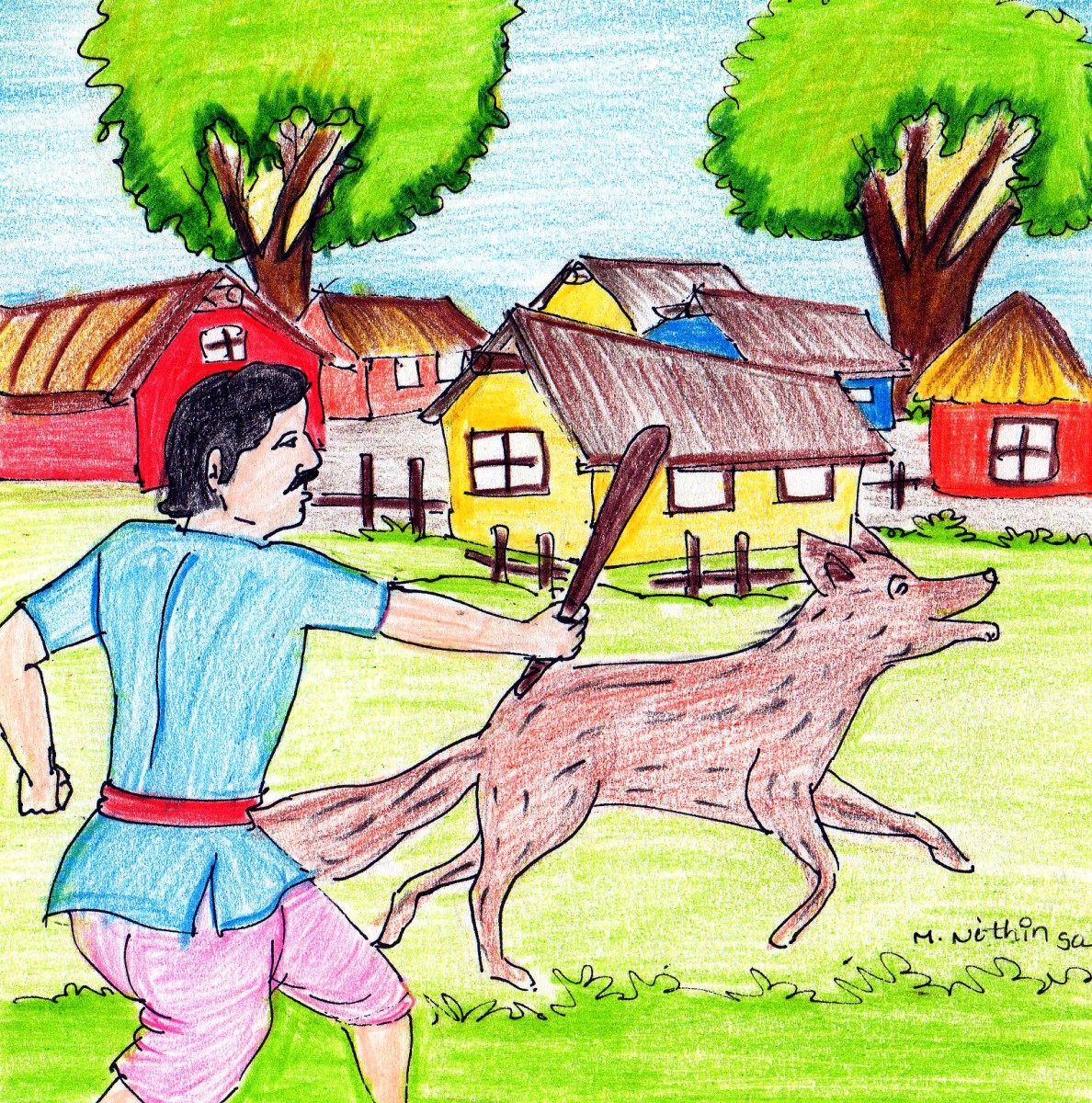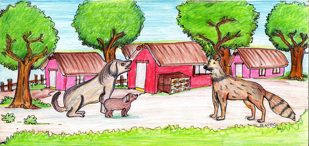 కోళ్ల అరుపులు వినగానే బయటికి వచ్చిన కుక్కలు గట్టిగా మొరిగాయి. వాటి అరుపులు విన్న ఊళ్ళోవాళ్లంతా కట్టెలు పట్టుకొని వచ్చి తోడేలును చితకబాదారు.