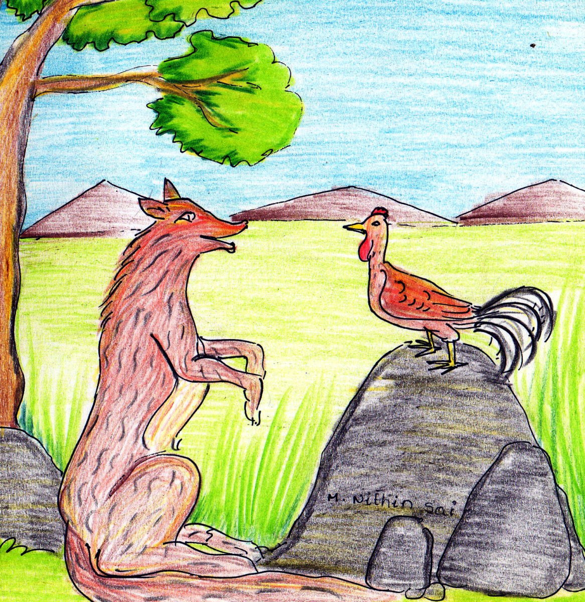 ఒకసారి అడవి అంచుననే దానికి పెద్ద కోడి ఒకటి కనిపించింది. దాన్ని చూడగానే తోడేలుకు నోరు ఊరింది. కానీ అది తన చేతికి అంత సులభంగా దొరికేటట్లు లేదు.. "మీదికి దూకితే అది దొరక్కుండా పారిపోవచ్చు..ఏం చేద్దామా?" అనుకున్న తోడేలు స్నేహం నటిస్తూ, తను ఉన్న చోటినుండే : "ఏం అల్లుడూ?! ఎట్లా ఉంది ప్రాణం?" అంటూ పలకరించింది. కోడి దాన్ని చూడగానే కలవర పడింది.