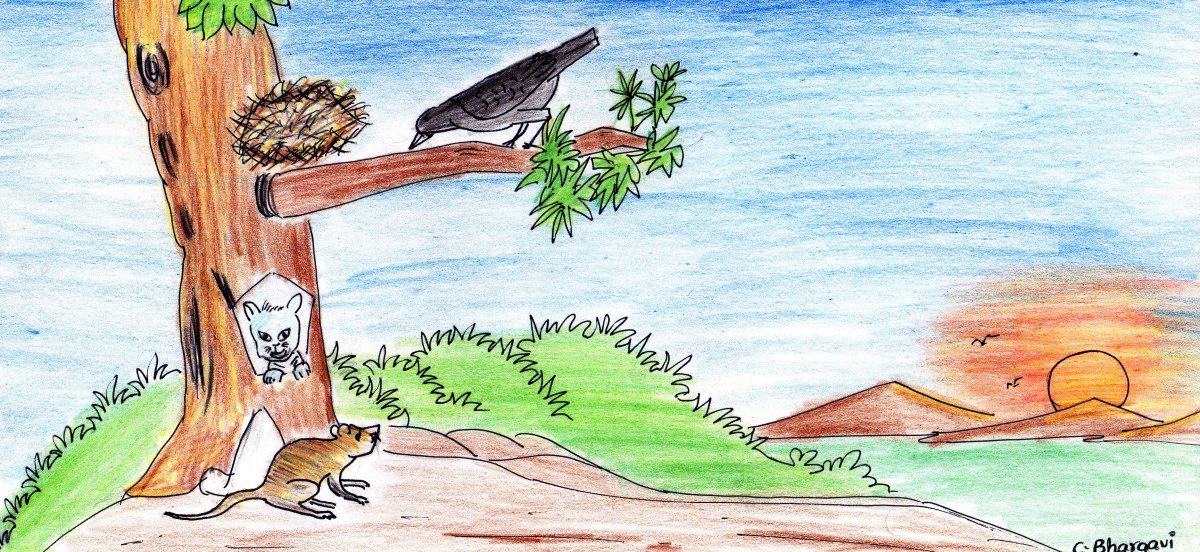కోగిర అడవిలో ఒక మర్రి చెట్టు ఉండేది. ఆ చెట్టు కొమ్మల్లో గూడు కట్టుకొని కాకి ఒకటి నివసిస్తూ ఉండేది. అదే చెట్టు తొర్రలో ఒక పిల్లి, చెట్టు క్రింద కన్నంలో ఒక ఎలుక నివసించేవి.