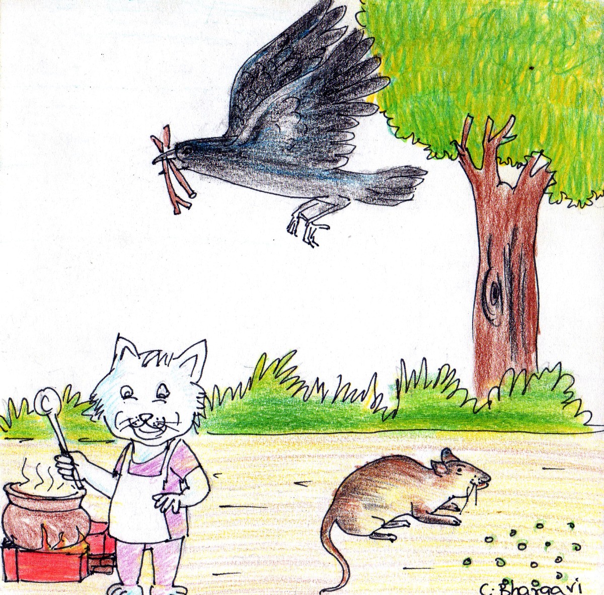 "ఎవరికి సులభంగా వచ్చిన పని వాళ్ళు చేద్దాం. నువ్వు పుల్లలు ఏరుకురా. ఎలుక గింజలు తెస్తుంది. నేను వంట చేస్తాను" అన్నది పిల్లి.