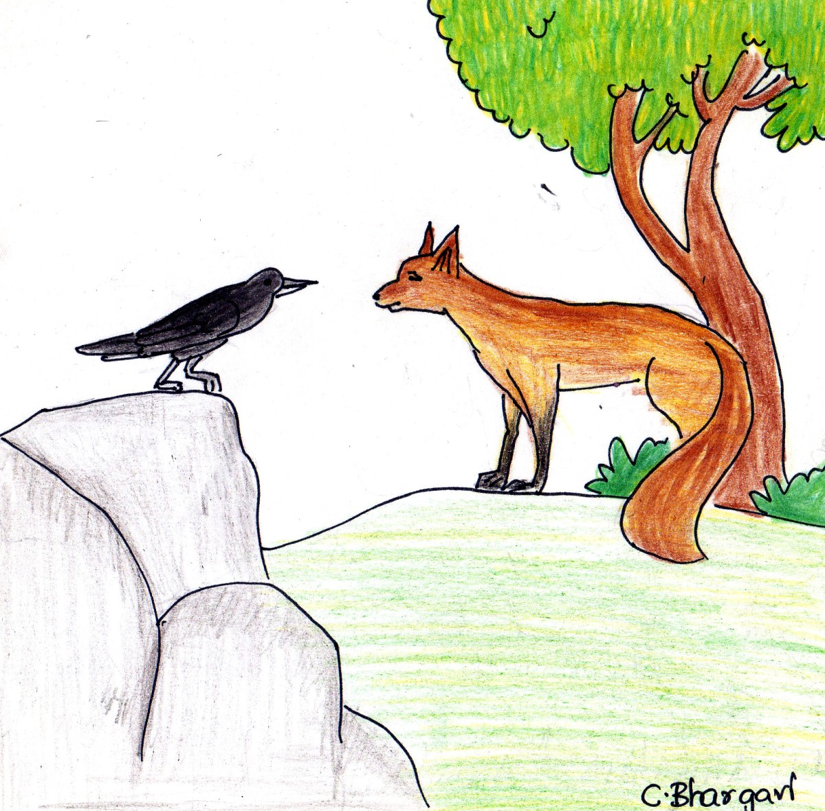 నక్క దాన్ని వదల్లేదు. బ్రాహ్మణుడు-దొంగలు కథ గుర్తు చేసుకున్నది. మళ్ళీ మళ్ళీ కాకిని పలకరించటం, మళ్ళీ మళ్ళీ అదే మాట అనటం చేసింది.