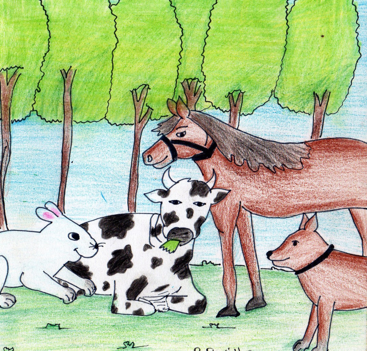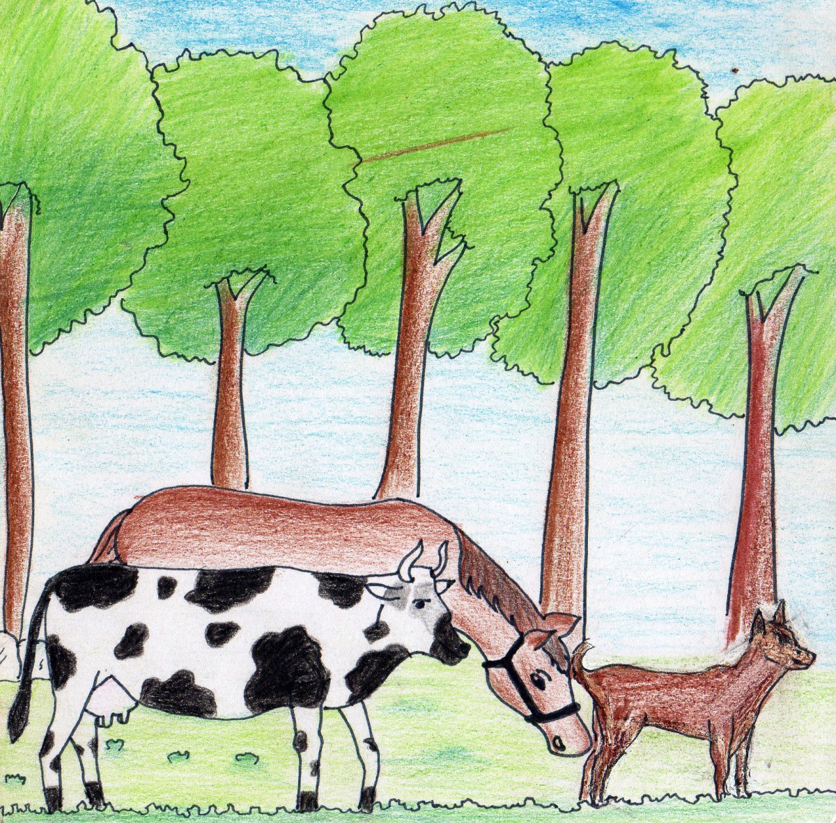 ఆవు, గుర్రం అడవికి వెళ్తుంటే ఒక కుక్క కూడా వాటితో పాటు అడవికి పోయేది. అట్లా రోజూ కలిసి వెళ్తూ, వస్తూ అవి మంచి స్నేహితులయ్యాయి. ముచ్చట్లు చెప్పుకొనీ చెప్పుకొనీ వాటి స్నేహం బాగా గట్టి పడింది.