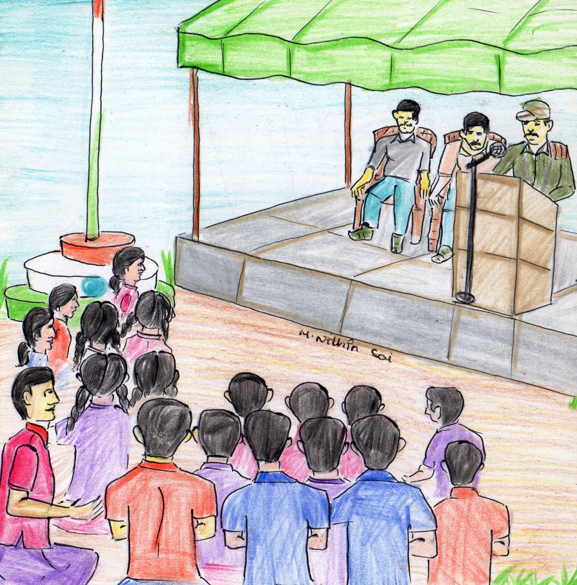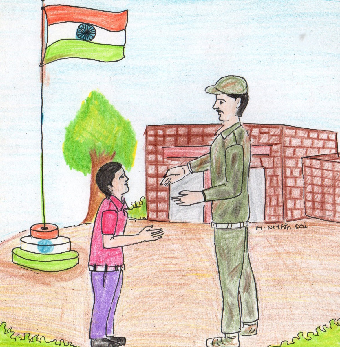 మీరు పెద్దయ్యాక రకరకాల వృత్తులు చేపడతారు. దేశానికి మేలు చేసే పనులు చేయండి. మీలోంచి కొందరైనా వీర సైనికులు రావాలని నా కోరిక.. " శ్రీరాం మాట్లాడుతున్నంత సేపూ పిల్లలు ఎంతో ఆసక్తిగా విన్నారు. ఆ రోజున శ్రీరాం మన దేశం గొప్పదనాన్ని గురించి మాట్లాడాడు. మనందరం ఎట్లా కలిసి ఉండాలో చెప్పాడు. సైన్యంలో రకరకాల ప్రాంతాలకు చెందినవాళ్ళు, మతాలకు చెందిన వాళ్ళు అందరూ ఎట్లా కలిసి పని చేస్తారో చెప్పాడు. క్రమశిక్షణ, సమయ పాలన గురించి మాట్లాడాడు. ఆ రోజున పిల్లలు మంత్ర-ముగ్ధులైపోయారు.