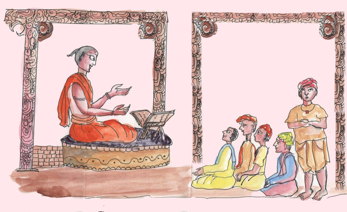 "ఈ గ్రంథాలను ఒక్కసారి తీసుకువెళ్ళి, గురువుగారికి చూపించి, మళ్ళీ తెచ్చేస్తాను" అని వాటిని జాగ్రత్తగా ఊళ్ళోకి తీసుకువెళ్ళాడతను. వాటిని చూసిన రామశర్మ ఆశ్చర్యపోయాడు. అవి లోక ప్రసిద్ధి చెందిన కారుణ్య మహాముని రచించిన సూక్తులు. ఎలా నడచుకుంటే జీవితం సక్రమంగా ఉంటుందో చెప్పే శ్లోకాలవి. ఇన్ని రోజులుగానూ వాటిని కర్ణా కర్ణిగా విని చెప్పుకునేవాళ్ళు అందరూ. కానీ ఇప్పుడు దొరికినవి, వందల సంవత్సరాల క్రితం రాసిన గ్రంథాలు! వాటి విలువ అమూల్యం!
