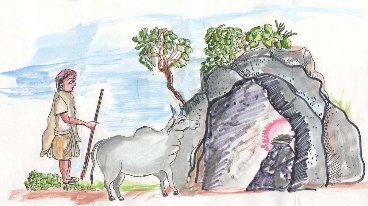 ఆ సమయంలో మేత మేసేందుకు వెళ్ళిన ఆవుల్లో ఒకటి తప్పిపోయింది. దాన్ని వెతుక్కుంటూ కొండ అంతా తిరిగిన గోపాలుడికి చెట్ల గుబుర్ల వెనకగా గుహ ఒకటి కనిపించింది. "అరే! ఇన్నిసార్లు ఇటు వచ్చినా ఈ గుహ ఎన్నడూ కనబడలేదే?! ఇందులో ఏముంది?" అని ఆశ్చర్యపోతూ ఆ గుహలోకి ప్రవేశించాడు గోపాలుడు.
