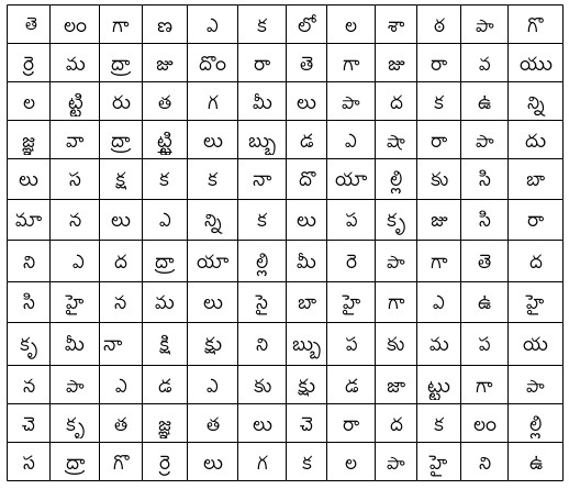 గారెలు, కషాయాలు, మట్టివాసన, దొంగలు, కృతజ్ఞతలు, పట్టుదల, సినిమాలు, పాఠశాల, మీనాక్షి, ఎన్నికలు, సైనికులు, హైదరాబాదు, యువరాజు, ఎలుక, డబ్బులు, తెలంగాణ, ఉల్లిపాయ, గొర్రెలు, రుద్రాక్ష, పక్షులు:- ఈ పదాలన్నీ క్రింది పట్టికలో దాగున్నాయి-నిలువుగా, అడ్డంగా, వాలుగా, క్రింది నుండి పైకి -ఎటుపడితే అటు! వాటిని వెతికి వాటి చుట్టూ గుండ్రాలు గీయండి!