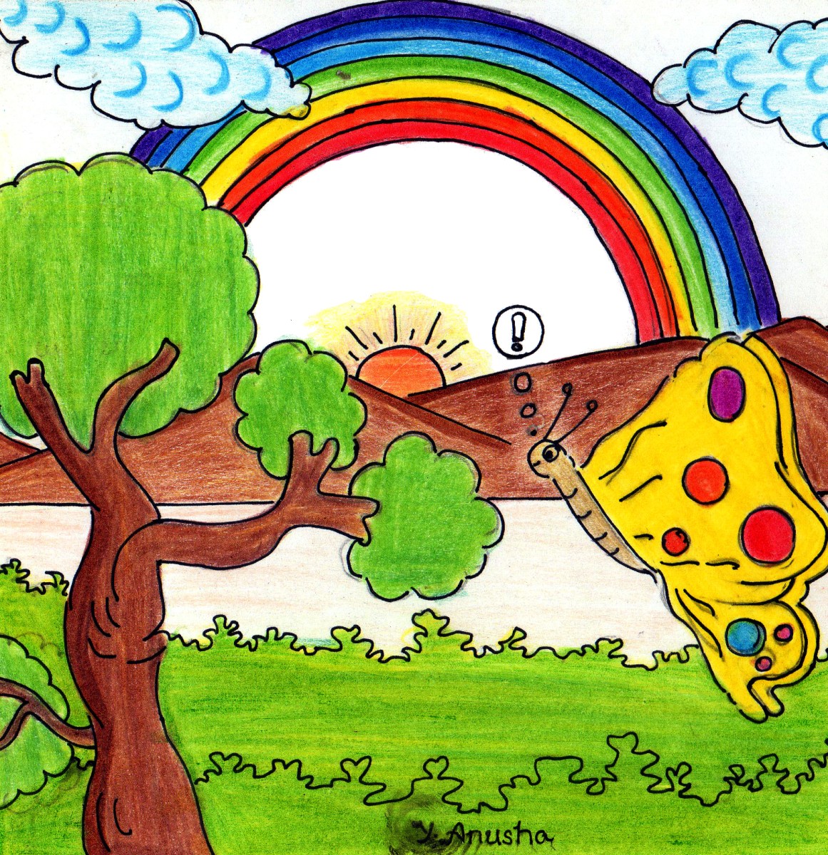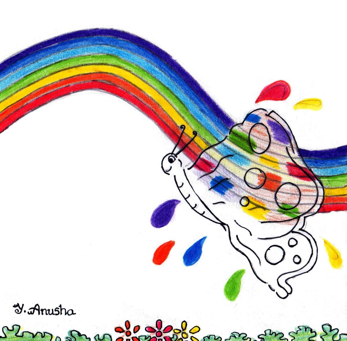 ఇంకేముంది, సీతాకోకచిలుక ఇంద్రధనస్సు మీద పొర్లింది; రంగులు రంగులుగా మారిపోయింది! ఆ వెంటనే వానజల్లుతో చుక్కల డిజైన్ కూడా వేయించుకున్నది!