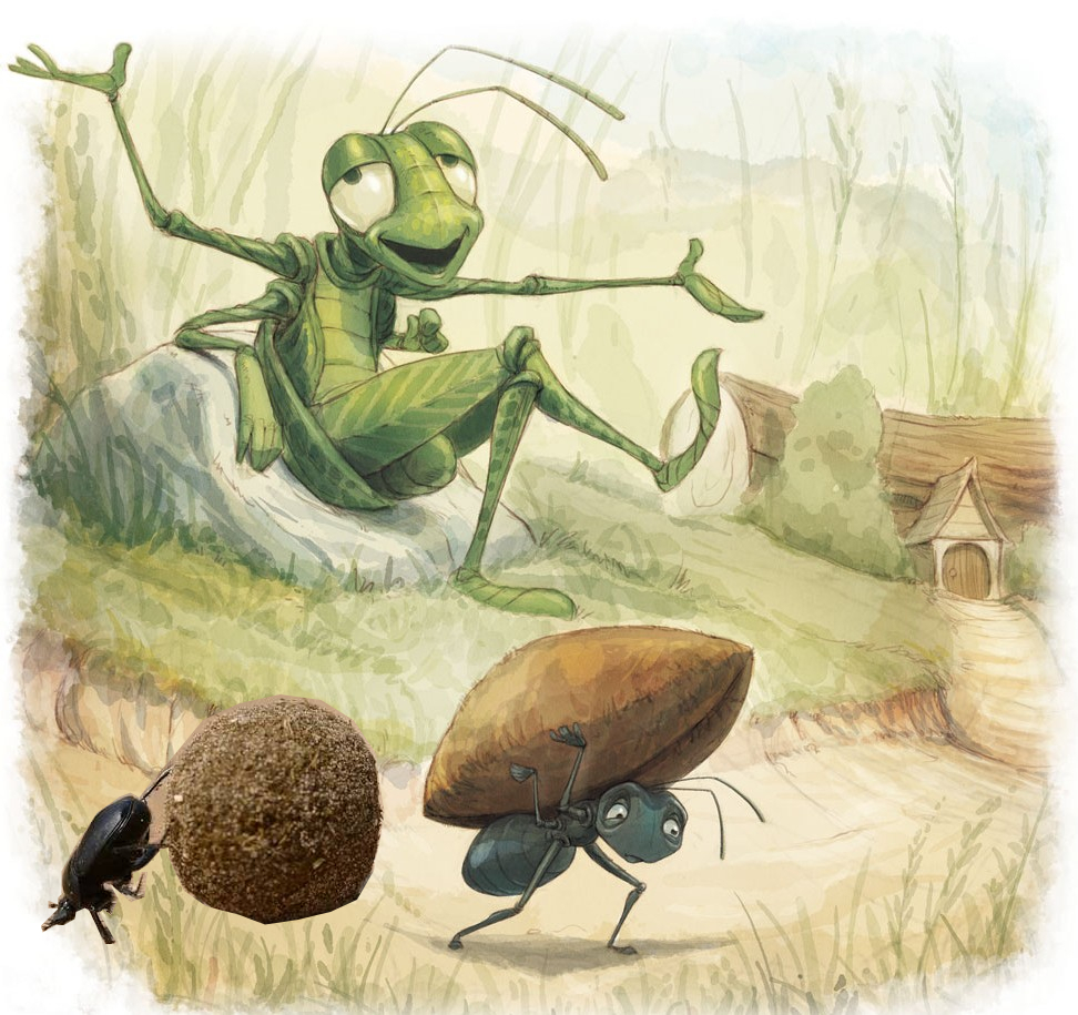 చీమ, మిడత ప్రతిరోజూ కలిసి తిరిగేవి, వానాకాలం కోసం అవసరమైన ఆహారాన్నంతా ముందుగా సేకరించుకునేవి. చీమ ఆహారాన్ని వాసన పట్టి చూపించేది; మిడత దాన్ని తెచ్చి చీమ పుట్ట దగ్గర విడిచేది. ఇక మిడత, పేడపురుగు రెండూ ప్రతిరోజూ కలిసి తిరిగి, ఎక్కడెక్కడి పాటలూ సేకరించుకొని పాడేవి. పేడపురుగు నోటితో తాళం పలికిస్తే, మిడత ఎగిరి గంతులు వేసేది. రెండూ సంతోషంగా బిగ్గరగా నవ్వుకునేవి.