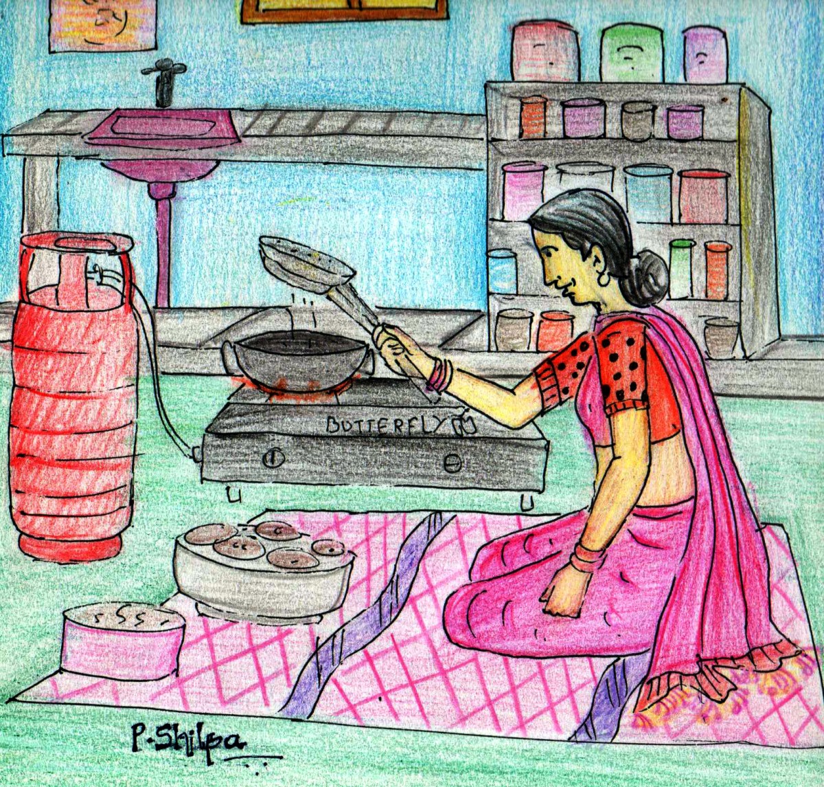 "ఊరికే ఇంతింత ఖర్చు పెట్టుకోకూడదు. ఒక్క నాలుగు అరిసెలు మాత్రం చేస్తాను- చెరి రెండూ వస్తాయి, చాలు!" అని కొంచెం బియ్యప్పిండి మాత్రం తీసుకొని, దానిలోకి కొంచెం బెల్లం పాకం వేసి కలిపింది పుల్లమ్మ. ముందుగా ఒక అరిసె చేయగానే, ఆ ఘుమఘుమలకి ఆమె నోరు ఊరింది.