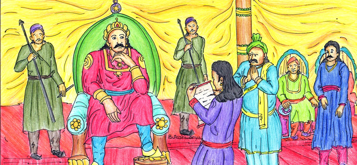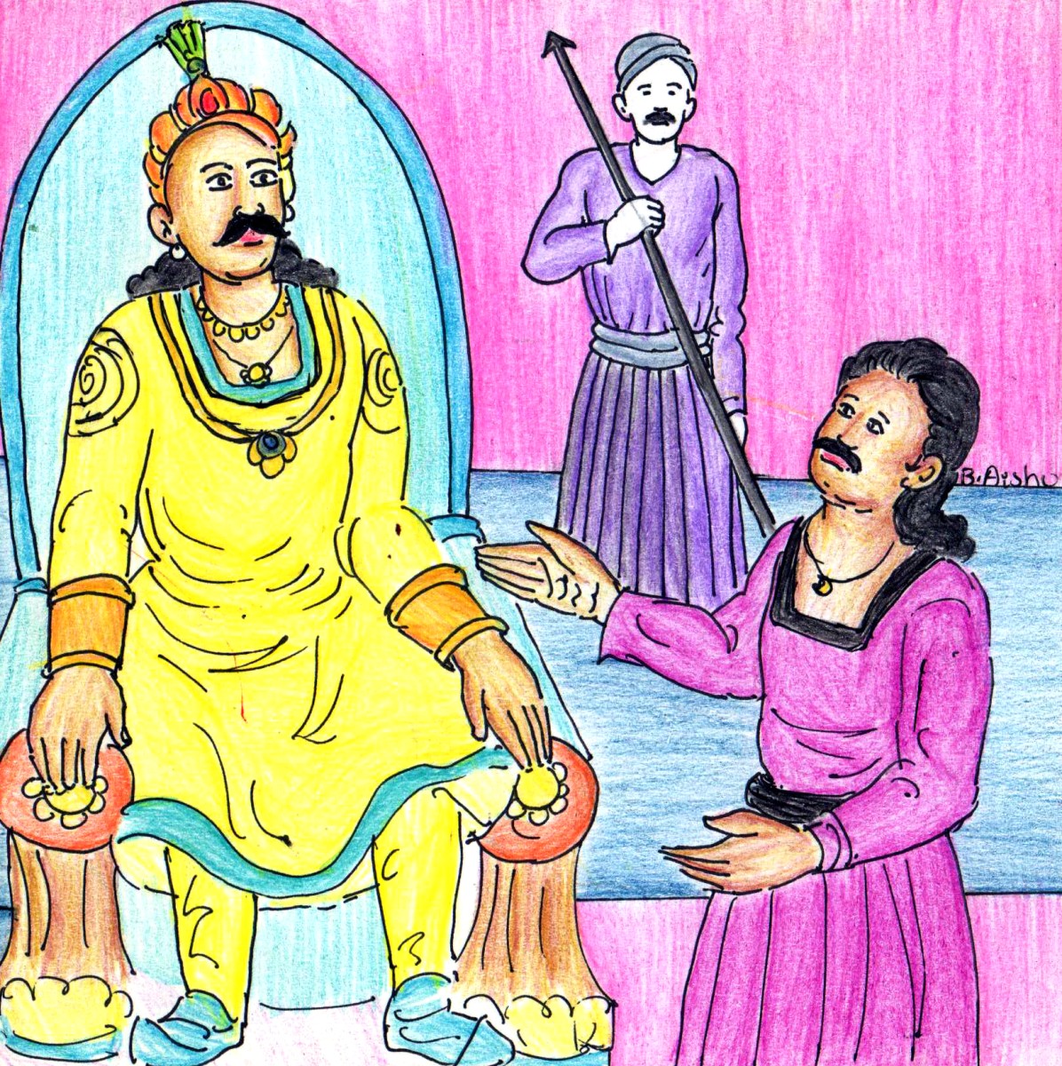 "పొరుగు రాజ్యపు దూతగా వచ్చాడు వీడు. తన రాజ్య గౌరవాన్ని కూడా మన్నించకుండా ఇంత దురాగతానికి ఒడిగట్టాడు. వీడికి ఏం శిక్ష విధించాలి?" అడిగారు రాణిగారు. రాజుగారు తన మంత్రులవైపు చూసారు. "మరణశిక్ష" అన్నారు మంత్రులు ఏకగ్రీవంగా.