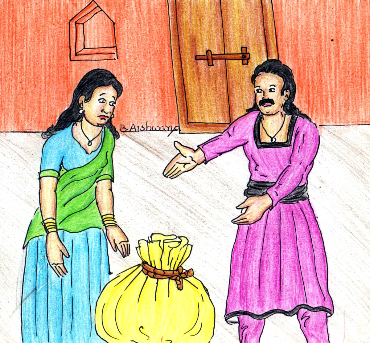 భటులు మూటని తెచ్చి పెట్టారు. రాణిగారి చీరతో కట్టబడిన ఆ మూటని జాగ్రత్తగా విప్పారు. అందులో పాత బట్టలు తప్ప మరేవీ లేవు!