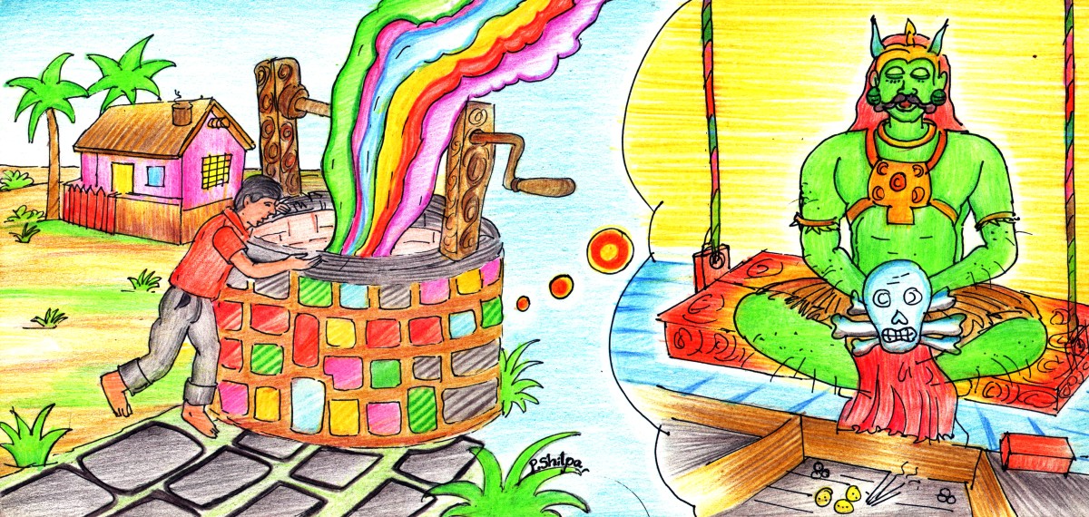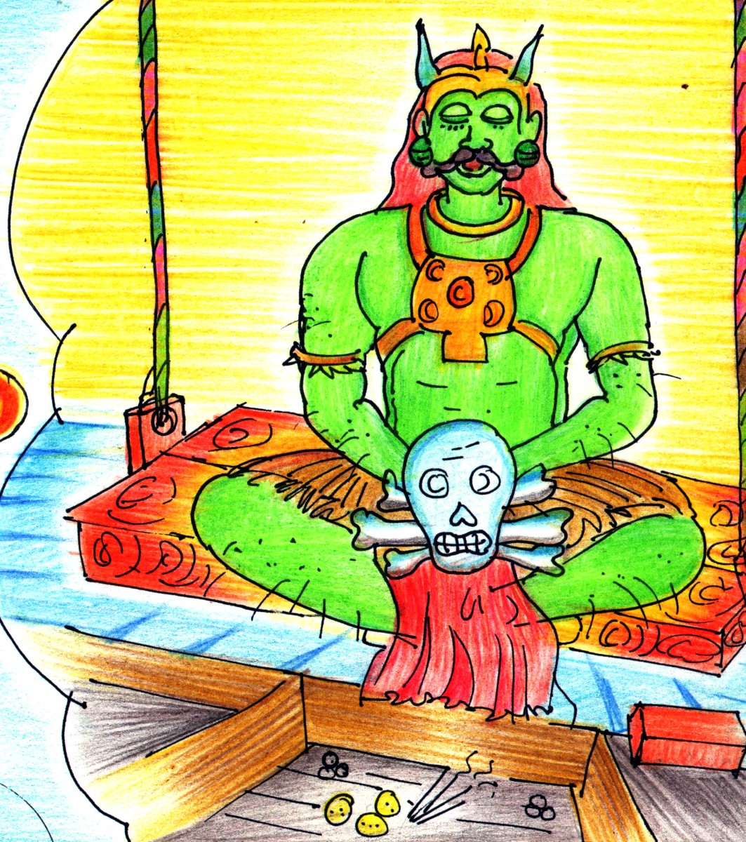 బావిలో ఒక రాక్షసుడు. దుమ్ము కొట్టుకొకుండా జుట్టుకు ఓ ఎర్రటి బట్ట, ఆకు పచ్చని వొంటి నిండా వెంట్రుకలు, ఎర్రని-తెల్లని బొట్లు. మెడలోను, చేతులకు ఎముకల దండలు. నడుము చుట్టూ ఒక పుర్రెల దండ. వాడు చకిలంమకిలం వేసుకొని కూర్చొని, ఉయ్యాల లాగా ఊగుతూ ఏవేవో మంత్రాలు జపిస్తున్నాడు. వాడికి ఎదురుగుండా ఒక యజ్ఞ గుండం ఉంది. మంత్రాలు చదువుతూ మధ్య మధ్యలో ఆ మంటలోకి ఏవో పొడులు విసురుతున్నాడు వాడు. ఒక మూలగా మరుగుజ్జు ఒకడు పెద్ద ఢంకా లాంటి దాన్ని "ఢుం ఢుం" అని కొడుతున్నాడు..