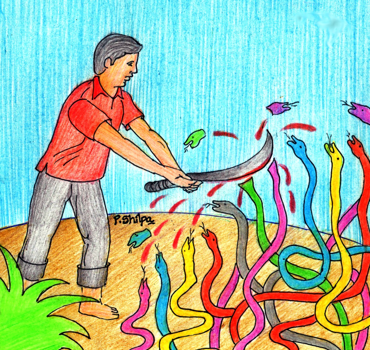 ఆ వెంటనే కొద్ది సేపు అఖిల్కు తల తిరిగింది. తను రకరకాల పాములతో యుద్ధం చేస్తున్నట్లు, బలి ఇచ్చే కత్తితో వాటిని చంపుతున్నట్లు అనిపించింది.