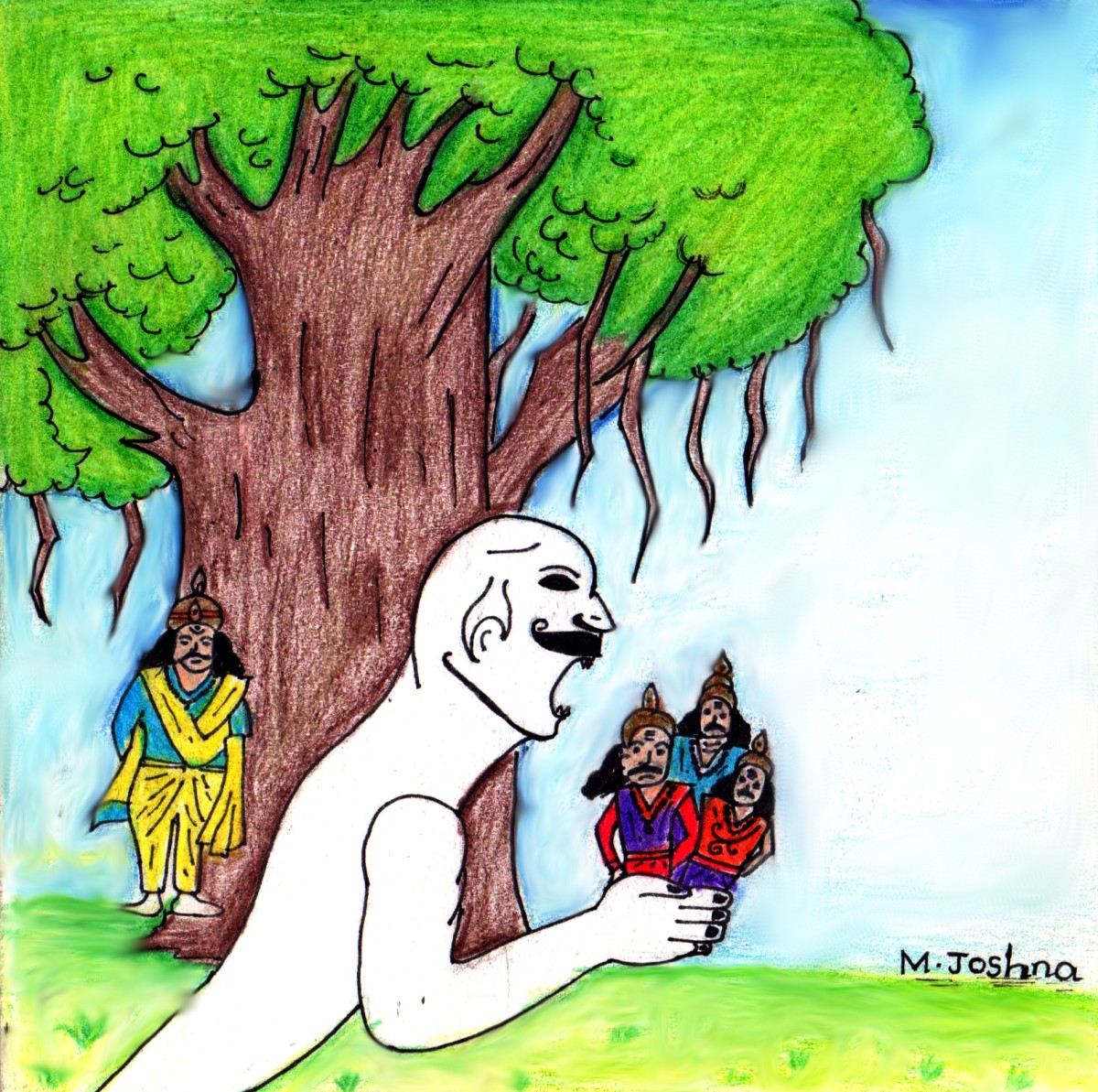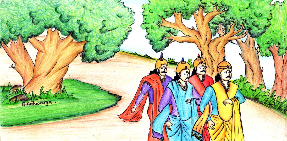 వాడికి ఈ నలుగుర్నీ చూడగానే చాలా సంతోషం వేసింది; దానితోబాటు కొంత విచారం కూడా కలిగింది. ఏమంటే బ్రహ్మ శాపం ప్రకారం వాడు ఒక రోజున ఒక్క ధైర్యశాలిని మించి తినలేడు! అలా ఇప్పుడు వీళ్లను నలుగుర్నీ ఒకేసారి మ్రింగేసే అవకాశం పోయింది వాడికి.