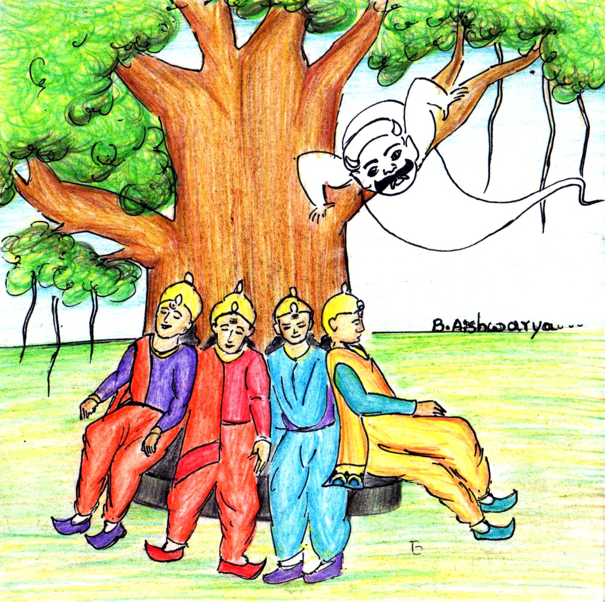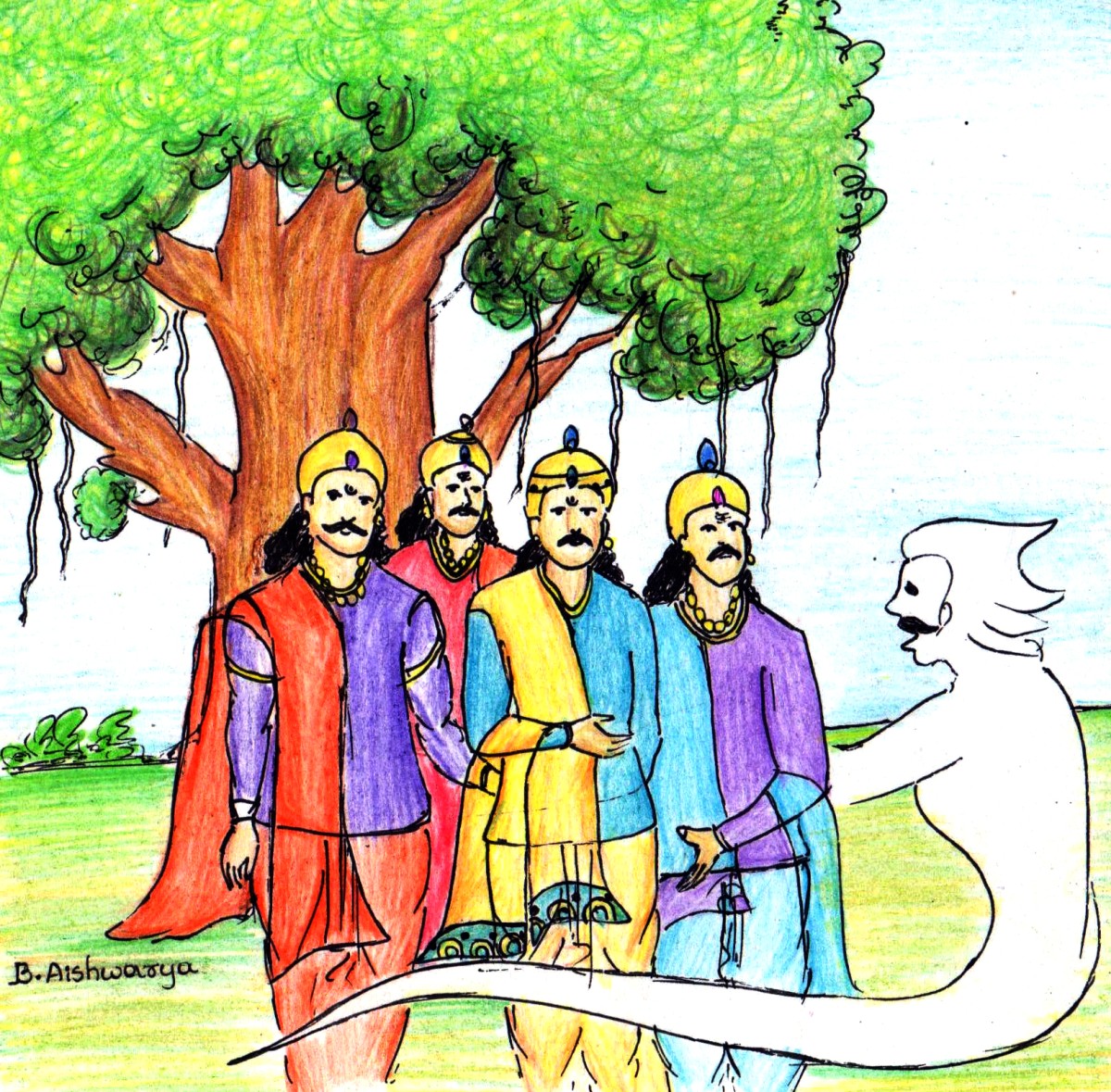 చంద్రప్రభుడి మిత్రులు కిశోరుడు, పిప్పలుడు, అనూరుడు ముగ్గురూ మూడు సామంత రాజ్యాల యువరాజులు. యువకులు నలుగురూ కూడా సాహసులూ, ధైర్యవంతులూ, ఔత్సాహికులూనూ. వాళ్ళు అలా తిరిగి వస్తుండగా మార్గ మధ్యంలో ఒక పెద్ద మర్రి చెట్టు కనిపించింది. అనేక శాఖలతో ఒక పెద్ద అరణ్యంలాగా విస్తరించి ఉన్న ఆ చెట్టుని చూడగానే మిత్రులు నలుగురికీ అక్కడ కొంత సేపు విశ్రమించాలనిపించింది.