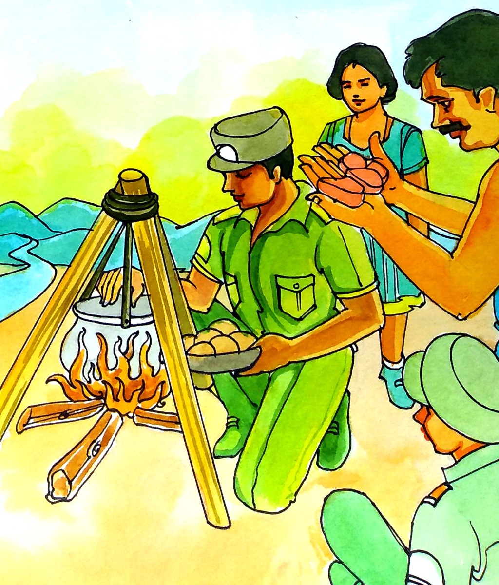 నెలలుగా సరైన భోజనం లేక తపించి పోతున్నారు పీటా, షాషాలు. నిజంగానే వాళ్ళ దగ్గర తినేందుకు ఏమీ లేవు. అడవుల్లో కనబడ్డ ఏ జంతువునో పట్టుకొనేందుకు ఒక పెద్ద సంచి, దాన్ని ఉడకవేసుకొని తినేందుకు ఒక పెద్ద గిన్నె తప్ప ఇంక వాళ్ల దగ్గర వేరే ఏమీ లేవు. సార్జంట్ మాటలతో వాళ్ళకు ఆశ పుట్టింది. క్షణాల్లో ఆ ఆశ కాస్తా ఆకలిగా పరిణమించింది.