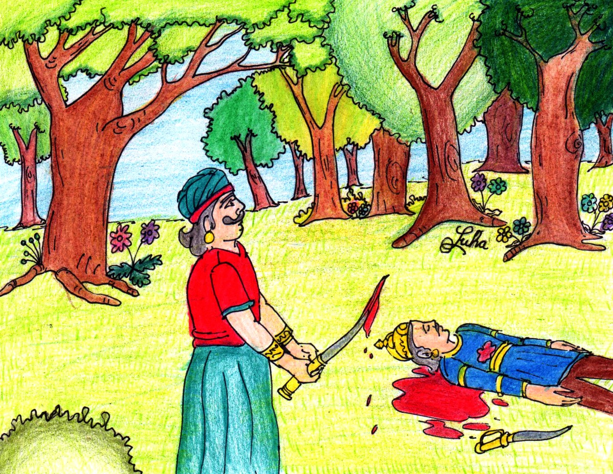 అంతలోకే వార్తాహరుడొకడు దుర్వార్తను మోసుకొచ్చాడు: రాజుగారు ప్రజల కష్టాలు విచారించే క్రమంలో రాజ్య సరిహద్దులో బస చేసారు. అంతకు ముందు రోజు రాత్రి ఆకస్మికంగా శత్రుసైన్యం జరిపిన దాడిలో రాజుగారు వీరమరణం చెందారు!