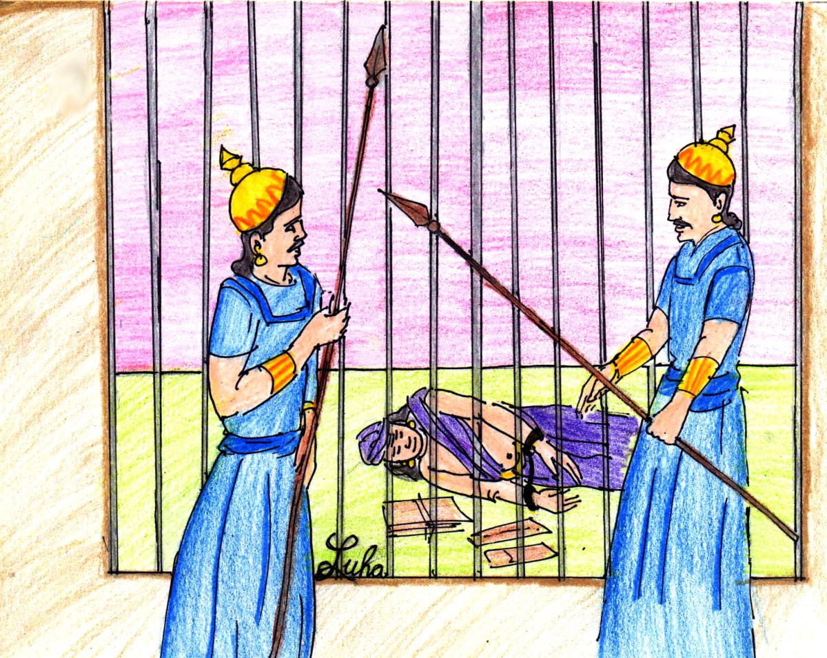 భటులు తక్షణం హనుమంతుని చెరసాలలో బంధించారు. అనేక రకాలుగా ప్రశ్నించారు అతన్ని. ఎన్ని రకాలుగా అడిగినా హనుమంతు తను చెప్పిందే మళ్ళీ మళ్ళీ చెబుతున్నాడు తప్ప మాట మార్చట్లేదు. "ఆలస్యం ప్రమాదానికి దారి తీస్తుంది. బాద్యత గలవారిని ఎవరినైనా రమ్మనండి" అంటాడు; "అసలైనా నాదగ్గరికి వచ్చినవాళ్ళ జాతకాలు చూసుకొని హాయిగా ఉండక, నాకెందుకు వచ్చింది ఈ ఖర్మ? అసలు రాజుగారి జాతకాన్ని చదివి చెప్పేందుకు అస్థాన జ్యోతిష్యులు ఉంటారు కదా?" అని వాపోతాడు హనుమంతు. మరునాడు ఉదయం అస్థాన జ్యోతిష్యుడికి కబురు వెళ్ళింది. "ఇక్కడెవరో ఒకతను వచ్చాడు పల్లె నుండి. రాజుగారి గురించిన ముఖ్యమైన విషయం ఏదో చెబుతాడట. మీరు రావాలి కారాగారం దగ్గరికి" అని.