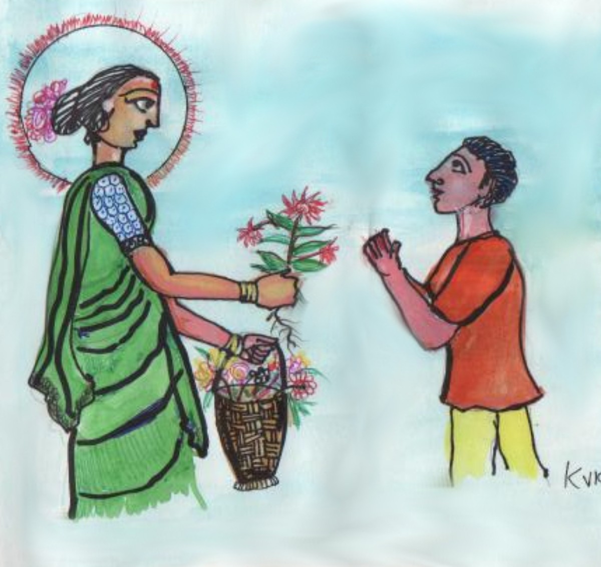 గిరి ఆమెను పలకరించగానే ఆమె "బాబూ, మంచి కూరగాయల మొక్కలు వేసావు. దేవుడి కోసం కొన్ని పూల మొక్కలు కూడా వెయ్యి" అని ఓ పూలమొక్కను ఇచ్చింది వాడికి. గిరి సరేనంటూ దాన్ని తీసుకొని "ఎంతమ్మా?" అని ధర అడిగాడు. "డబ్బులేమీ వద్దు నాయనా! మొక్క ఎదిగి పూశాక, దేవుడికి రోజూ ఐదు పూలు ఇవ్వు చాలు!" అంది పూలమ్మి.