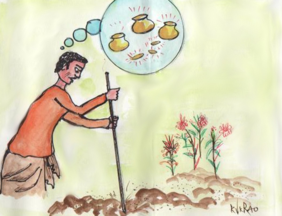 గిరి ఆ మొక్కని నాటేందుకని త్రవ్వబోతే చిత్రంగా అక్కడ ఖంగుమని శబ్దం వచ్చింది! జాగ్రత్తగా చూస్తే అక్కడో కంచు చెంబు, అందులో నిండా బంగారు నాణాలు!