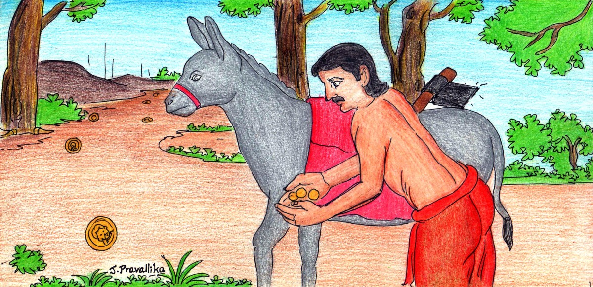 ఒక రోజు వాడు అడవిలో పోతావుంటే, దారిలో ఒక చోట ఒక బంగారు వరహా కనబడింది. దానిని తీసుకొని చుట్టూ చూసినాడు.. ఎవరూ కనబళ్ళేదు.