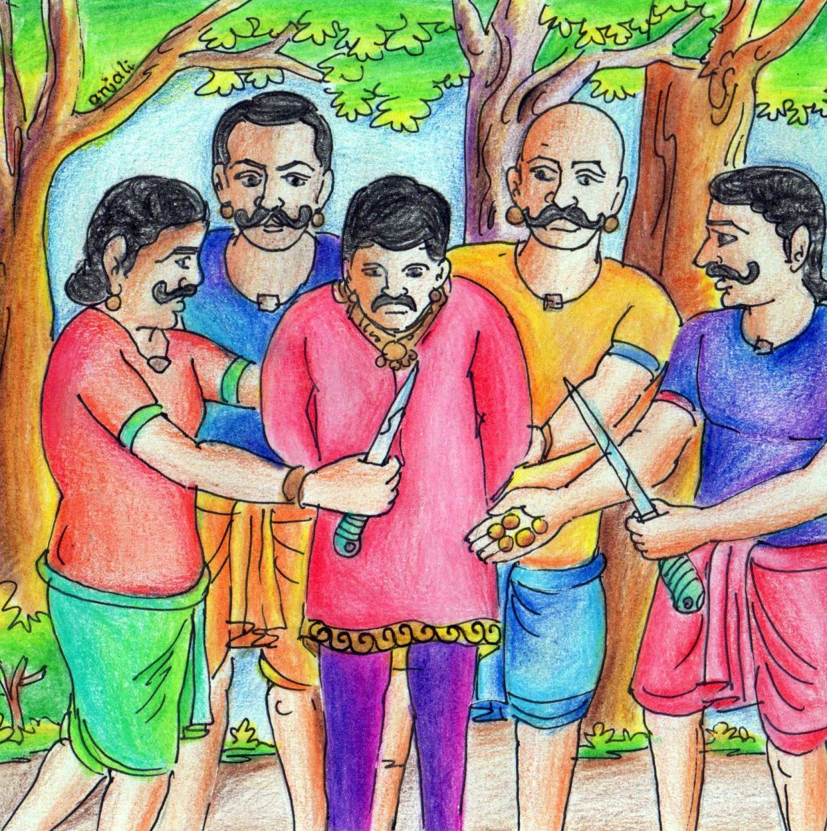 "ఏరా మానుంచే తప్పించుకోని పారిపోదామని అనుకుంటున్నావా" అంటా తలా నాలుగు పీకినారు. చేతిలోని బంగారు వరహాలన్నీ గుంజుకున్నారు. వాటితో పాటు ధనయ్య మెడలో గొలుసు, వేళ్ళ వుంగరాలు, చేతి కంకణం, బంగారు మొలతాడు- అన్నీ ఒలుచుకోని పోయినారు.
