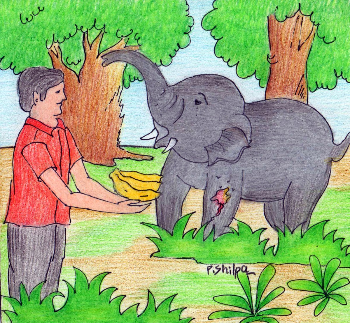 "అన్నయ్యా! మన బ్యాగులో డజను అరటిపళ్ళున్నై కదా, దీనికి పెట్టు పాపం" అంది చెల్లి, నా వెనకనుండి. నేను వెనక్కి తిరిగి వెళ్ళి తన చేతిలోంచి అరటిపళ్ళు తీసుకున్నాను. ఆలోగా రెండు ఏనుగులూ మా దగ్గరికే వచ్చేసాయి. నేను ఇచ్చిన అరటిపళ్లను తల్లి ఏనుగు తీసుకొని, కొన్ని పిల్లకు ఇచ్చి, కొన్ని తను తిన్నది. ఆలోగా చెల్లి ఆ ఏనుగుల చుట్టూ తిరిగి వచ్చి చెప్పింది- "దీని సమస్య అర్థమైంది. వెనక కాలికి కుడి వైపుగా పెద్ద గాయం అయ్యింది దీనికి" అని. "నానమ్మ చెప్పే కథల్లో లాగా ఏమైనా ఆకులు తీసుకొచ్చి కట్టు కడదాంరా దీనికి, పాపం" అంది.