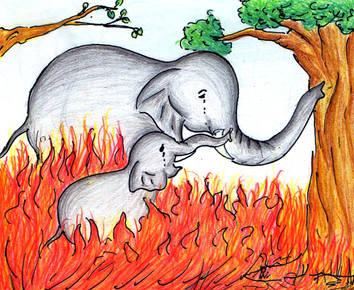 ఇద్దరూ రోడ్డు దిగి అడవిలోకి వెళ్ళారు. అక్కడ ఒక తల్లి ఏనుగు, ఒక గున్న ఏనుగు మంటల్లో చిక్కుకొని అరుస్తున్నాయి. వాటి చుట్టూతా కొంత దూరం వరకూ గడ్డి అంటుకున్నది. అవి నిలబడ్డ ప్రదేశం నుండి ఓ ఇరవై అడుగుల దూరాన ఉన్న చెట్లన్నీ అంటుకొని మంటలు క్రక్కుతూన్నాయి. ఎటువెళ్తే తప్పించుకుంటామో తెలీని పరిస్థితి ఏనుగులకు.