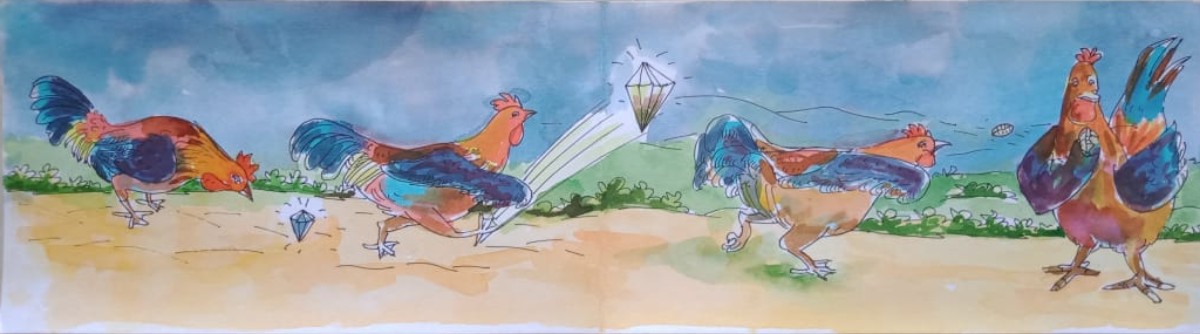 "బంగారు గింజ ఎంత పని చేసింది! దీని కంటే ఒక మామూలు గింజ దొరికి ఉంటే ఎంత బాగుండేది, కడుపన్నా నిండేది కదా!" అనుకుంది బుద్ధి తెచ్చుకున్న కోడిపుంజు, తూరుపు తెలవారుతుండగా.