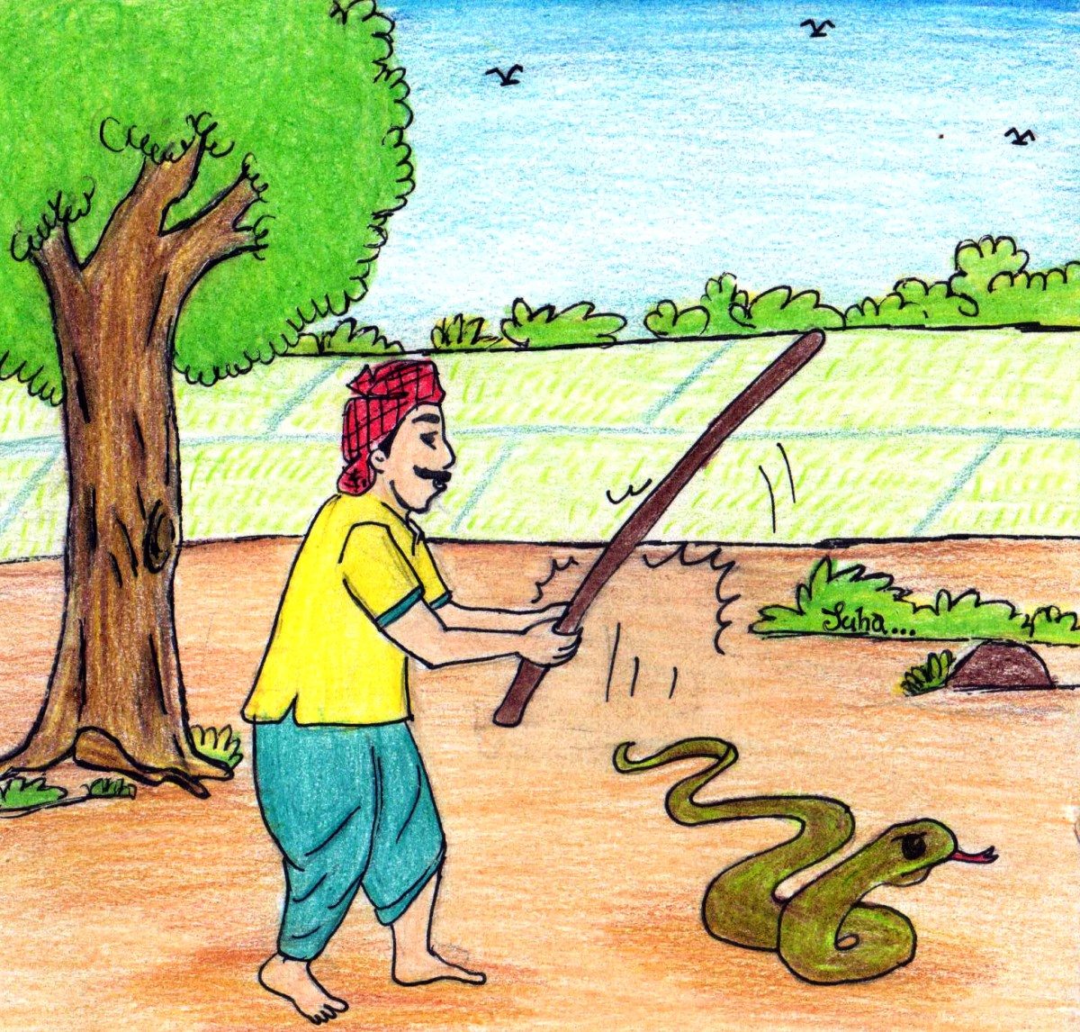 మరో రెండు వారాల తర్వాత, ఎద్దులకు కుడితి పెడుతుండగా, పక్కనే ఏదో 'సరసర' ప్రాకినట్లయి, మళ్ళీ పాము గుర్తొచ్చింది. చేతిలో పనినంతా వదిలి దిబ్బ వరకూ అన్ని వైపులా చూసుకొచ్చాడు. ఊహు! ఏమీ దొరక లేదు.