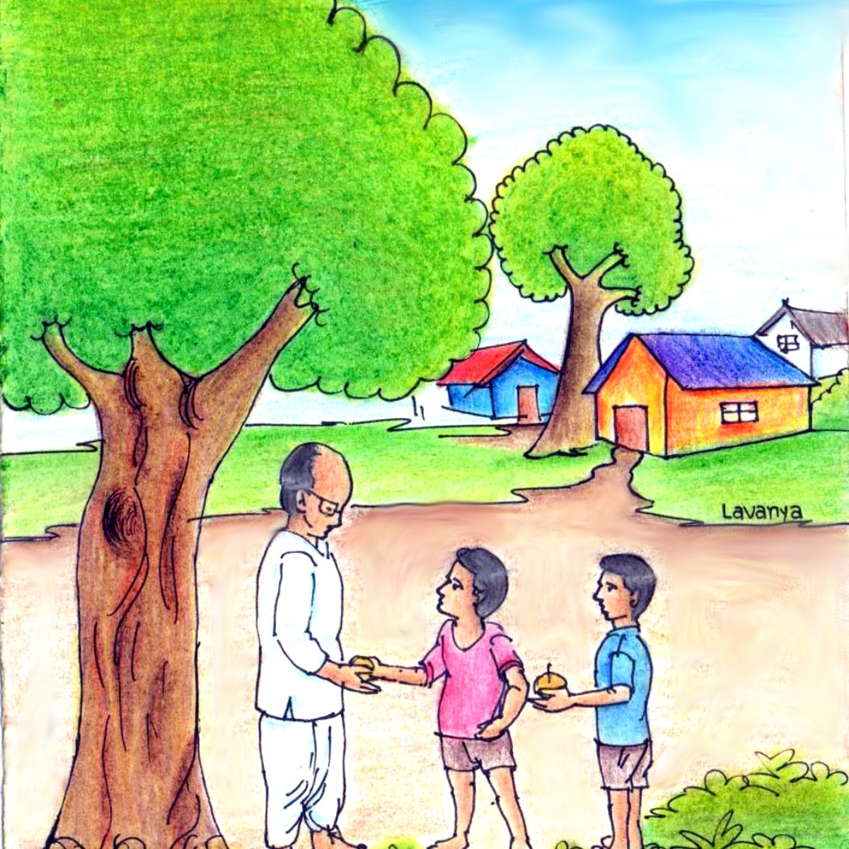 "ఇవి తినేందుకు పనికి రావేమో. ఇక్కడ ఒక్క పిట్ట కూడా లేదు చూసావా?" అన్నాడు పవన్, తనూ చుట్టూ కలయ చూస్తూ. "కొన్ని కోసుకెళ్దాంలే; మా తాతకు తెలీని చెట్టు లేదు. కనీసం ఇది ఏం చెట్టో అయినా తెలుస్తుంది" అంటూనే గబగబా చెట్టు ఎక్కిన గణేష్, చకచకా కొన్ని కాయలు కోసి, పవన్ దగ్గరికి విసిరాడు.