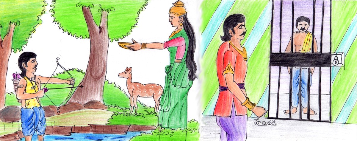 అతను విడిచిన బాణం జింకకు తగిలింది. అది ప్రాణం విడిచింది; కానీ వనదేవత మాత్రం తిరిగి రాలేదు. అంతలోనే అటుగా వచ్చిన సైనికులు మహేంద్రుడిని పట్టి బంధించారు. పాత్రతో సహా వాడిని రాజుగారి ముందు ప్రవేశపెట్టారు. రాజుగారు పాత్రను ఖజానాకు పంపారు; వన్య ప్రాణిని వేటాడిన మహేంద్రుడికి యావజ్జీవ కారాగార శిక్ష పడింది!