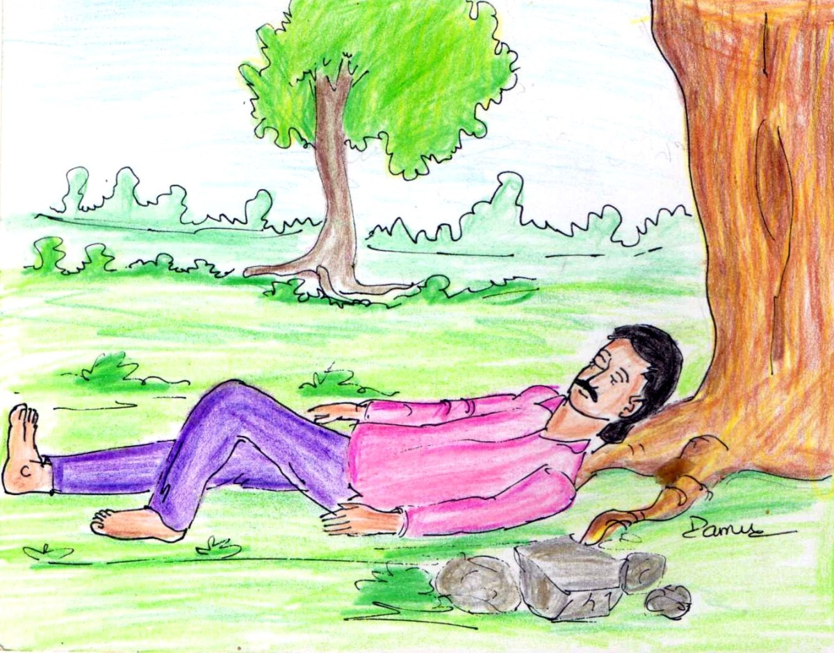అయితే దారిలోనే వాడు బాగా అలసిపోయి, ఓ చెట్టు క్రింద చేరగిలబడ్డాడు. మనిషైతే ఆగిపోయాడు కానీ, ఆలోచనలు ఆగవు కదా? అవి వాడిని నడిపించాయి...