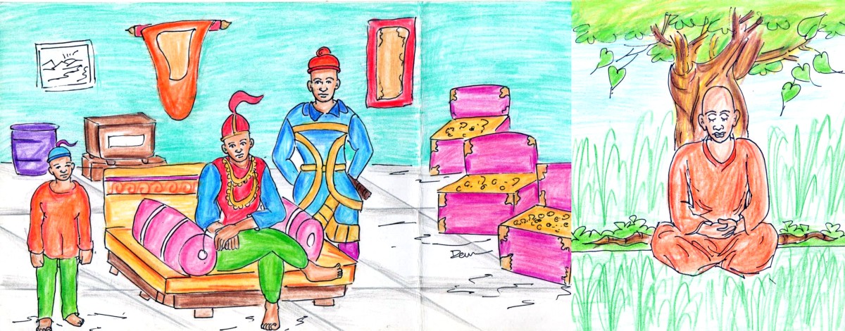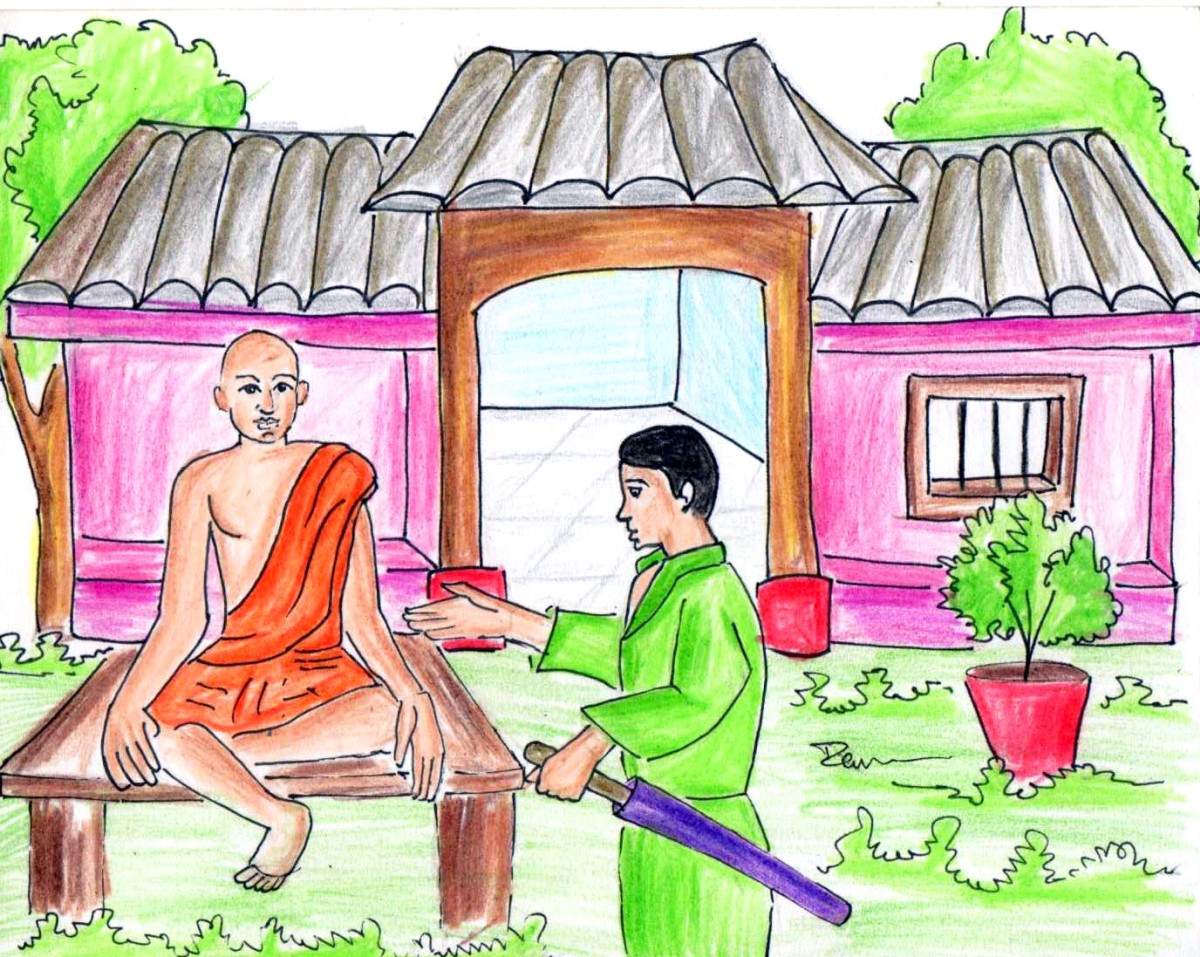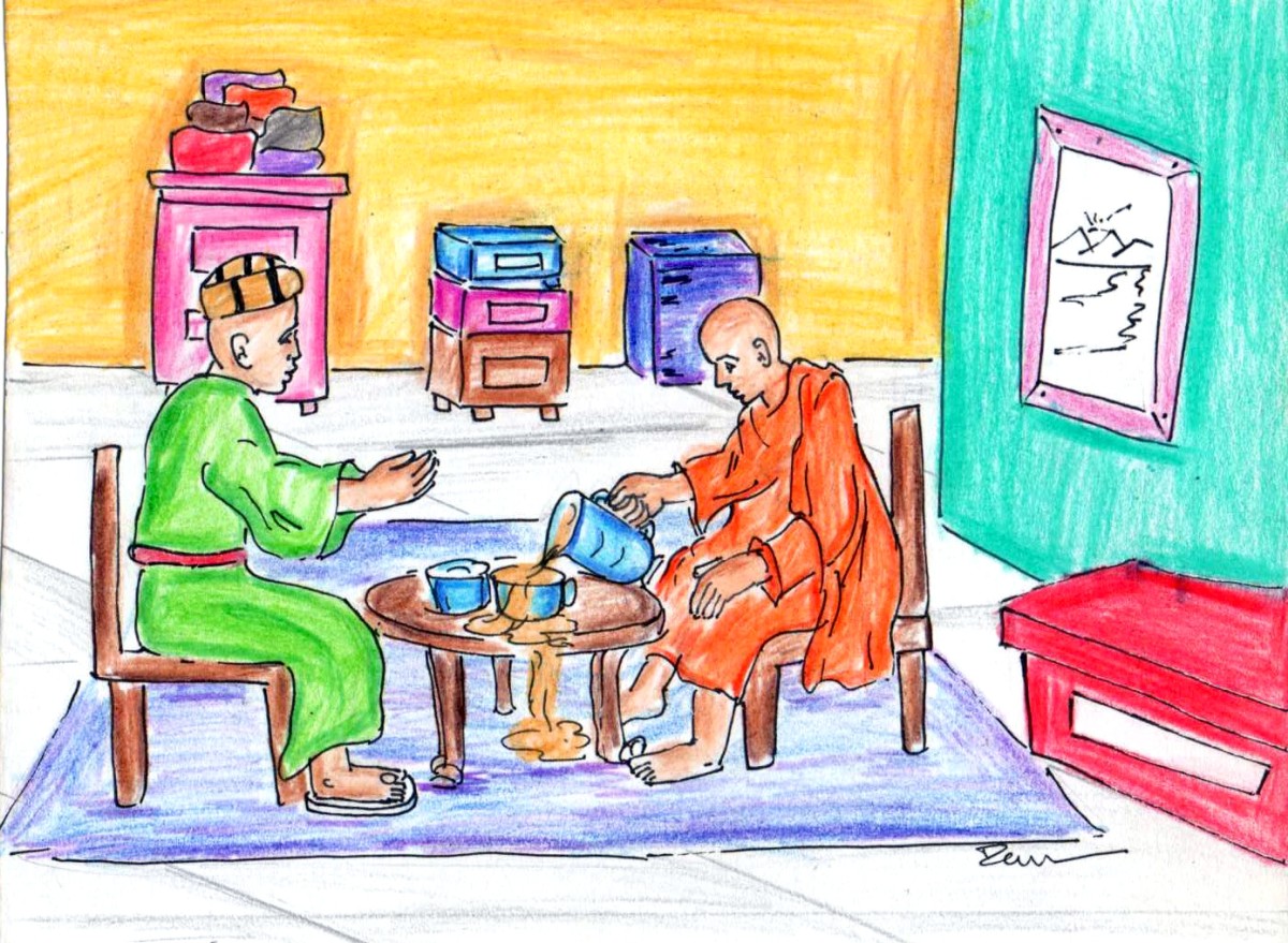 నాన్-ఇన్ టీ కషాయం తయారు చేస్తుండగా ఆయన కూర్చొని మాట్లాడుతూ పోయాడు- "సమయం విలువైనది కదా, ముందుగా మీకు నేనెవరో చెబుతాను" అంటూ కొద్దిసేపు తానెవరో, తనకు ప్రభుత్వంతో ఎంత దగ్గరి తనమో చెప్పాడు. ఆ తర్వాత "నేను పుట్టినప్పటినుండీ జ్ఞానేచ్ఛ బాగా ఉంది. చిన్న తనంలోనే త్రిపిటకాలు మూడూ కూడా, ఆ చివర్నుండి ఈ చివరివరకూ చదివాను. తర్వాత 'ఈ ఈ ఫలానా' పండితుల దగ్గర శిష్యరికం చేసాను. వాళ్ళ దగ్గర ఇదిగో, 'ఈ ఈ' విద్యలు నేర్చాను. ఈ విద్యలో అన్నీ బాగున్నాయి గాని, 'ఇది బాగా లేదు'- అందులో 'ఇది బాలేదు'. ఏం చేసినా ప్రాక్టికల్ గా ఉండాలి, నేను ఎప్పుడూ ప్రాక్టికల్ గా ఆలోచిస్తాను.." అంటూ పలు సంగతులు అనర్గళంగా మాట్లాడాడు.