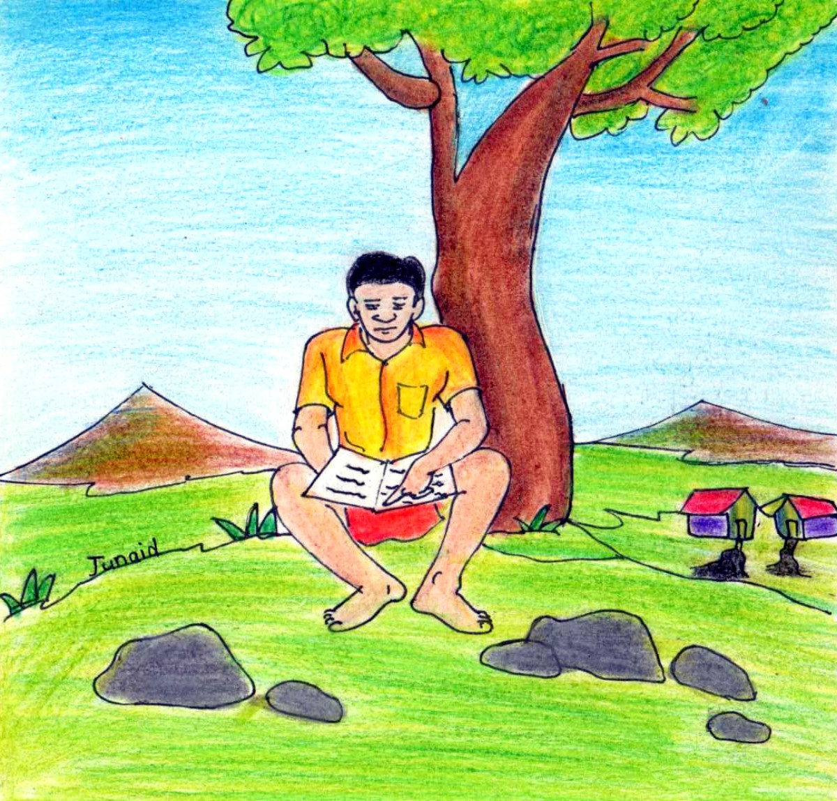కానీ మా ఇల్లు చాలా చిన్నది. అందుకని నేను మా ఊరికి చివర్లో ఉన్న కొండనెక్కి అక్కడ కూర్చొని చదువుకుంటాను. అక్కడ ఏవైనా చెట్ల క్రింద గడ్డిలో కూర్చోటం, రక రకాల జంతువుల్ని, పక్షుల్ని చూస్తూ చదువుకోవటం బాగుంటుంది. మా బడిలో కూడా చాలా రకాల మొక్కలు ఉన్నాయి. అందులో నాది కూడా ఒక మొక్క ఉంది! నేను దానికి రోజు నీళ్ళు పోస్తాను కూడా!.