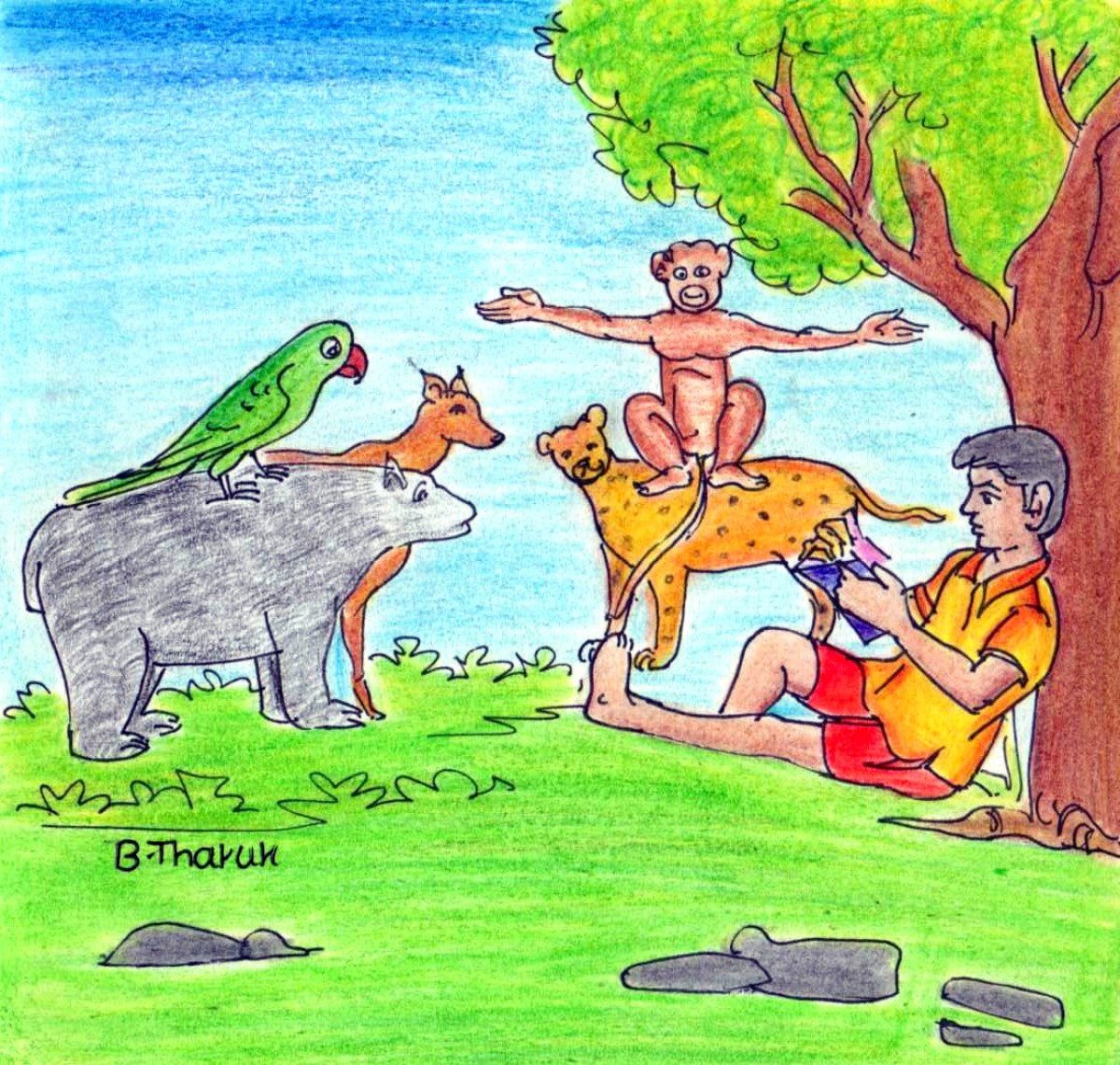 ఆయన నా ప్రక్కనుండే నడచుకుంటూ కొండ ఎక్కి పోయాడు, కానీ ఆయన వెనక వచ్చే జంతువులు మాత్రం ఒక్కటొక్కటిగా నా చుట్టూ ఆగాయి. ఎందుకనో. నాకు వాటిని చూసి భయం వేసింది. వాటిలోంచి ఎలుగుబంటి నా దగ్గరకు వచ్చి- " నీ రఫ్నోట్సు ఇటు ఇవ్వు" అంది.