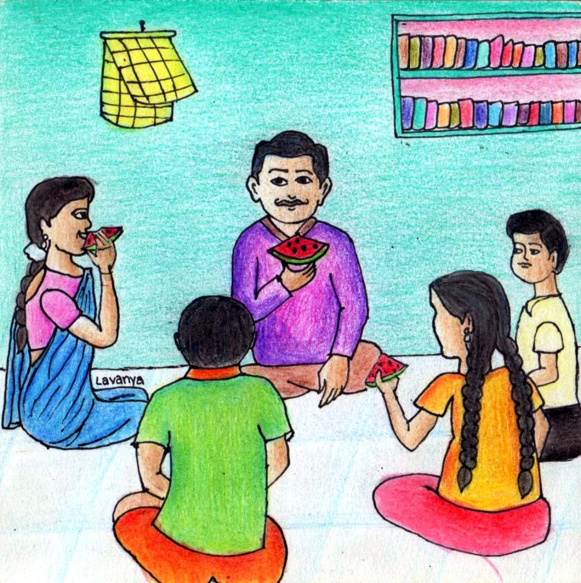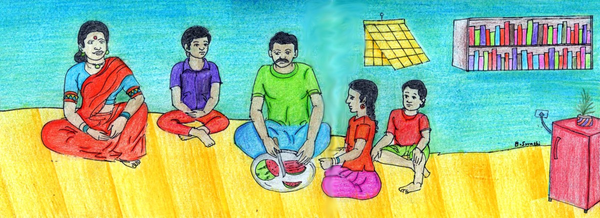"నేనేలే, తిన్నది! బాగా ఆకలివేసేసరికి, ఆగలేక తినేసాను. ఇప్పుడు ఇవన్నీ మీకే!" అన్నాడు కిరణ్, నోరు విప్పి. నారాయణ రెడ్డి వాడి భుజం తడుతూ "ఏమీ పర్లేదు. ఈ సారి ఇంకా పెద్ద పుచ్చకాయ తెచ్చుకుందాం. ఏదైనా సరే, అందరం కడుపునిండా తినటం ముఖ్యం. ఎప్పుడు తిన్నా, ఉన్నదాన్నే సమానంగా పంచుకొని తిందాం!" అన్నాడు.