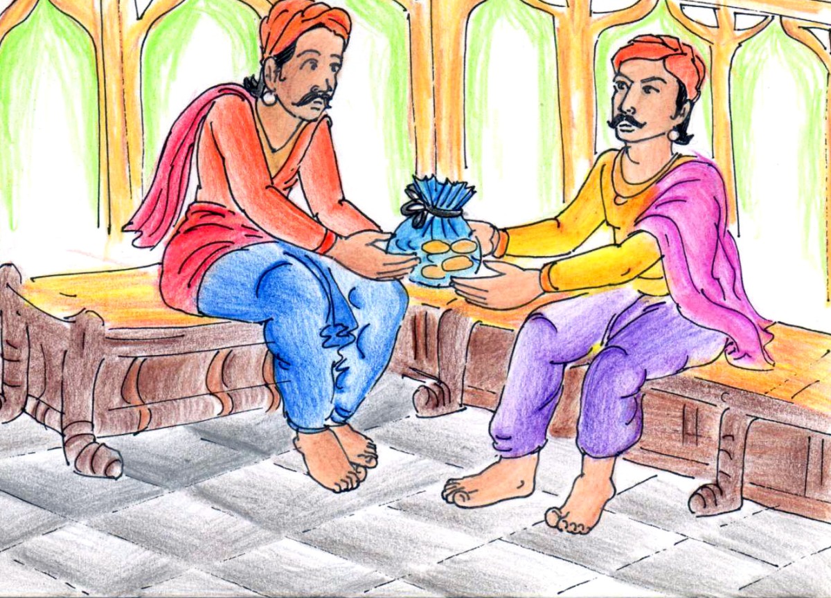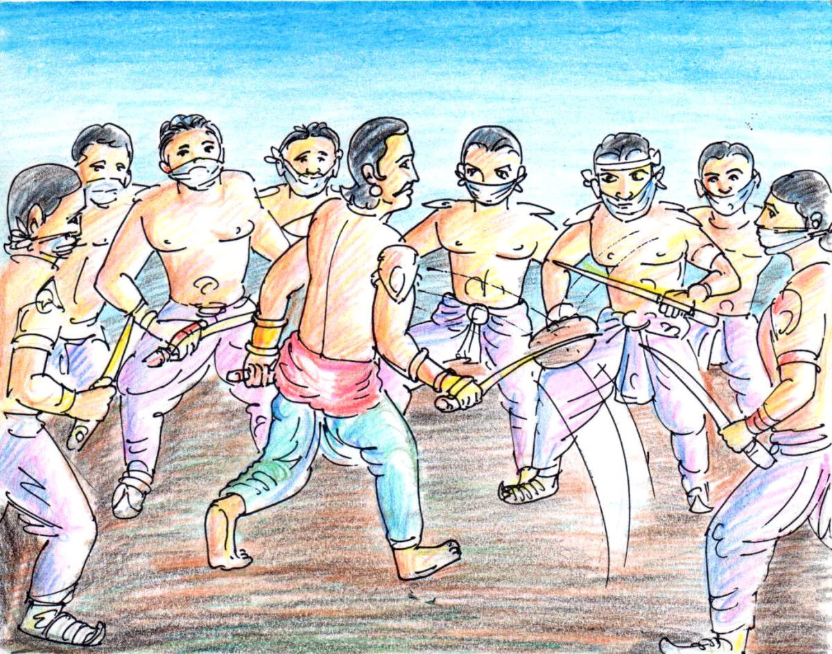 అందుకు సిద్ధంగా ఉన్న పురుషోత్తముడు తక్షణం కత్తి ఝుళిపించి వాళ్లతో పోరాడటం మొదలు పెట్టాడు. అంతలోనే ఆయనకు మద్దతుగా పెద్ద బలగంతో వచ్చి పడిన సేనాపతి, దుండగులందరినీ చటుక్కున బంధించేసాడు!