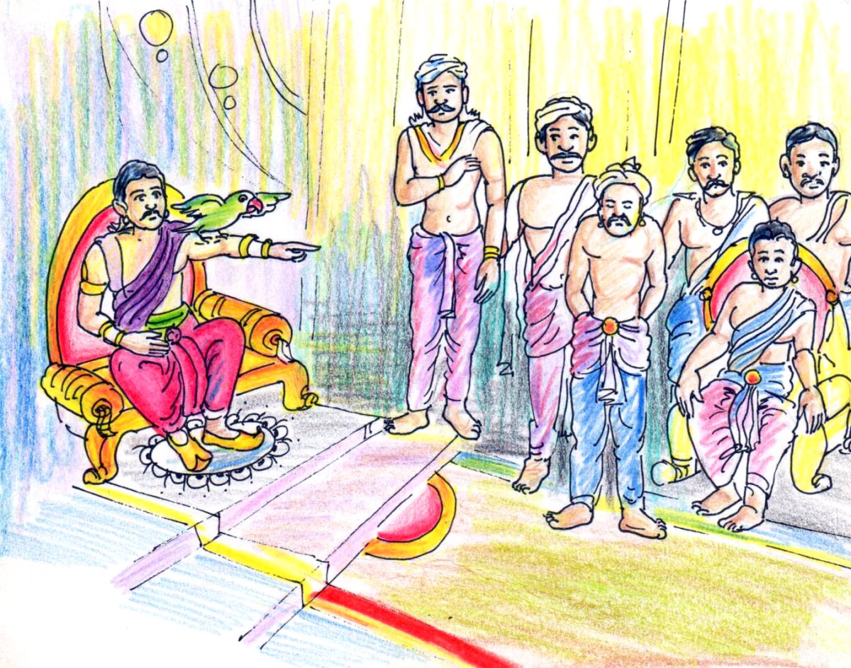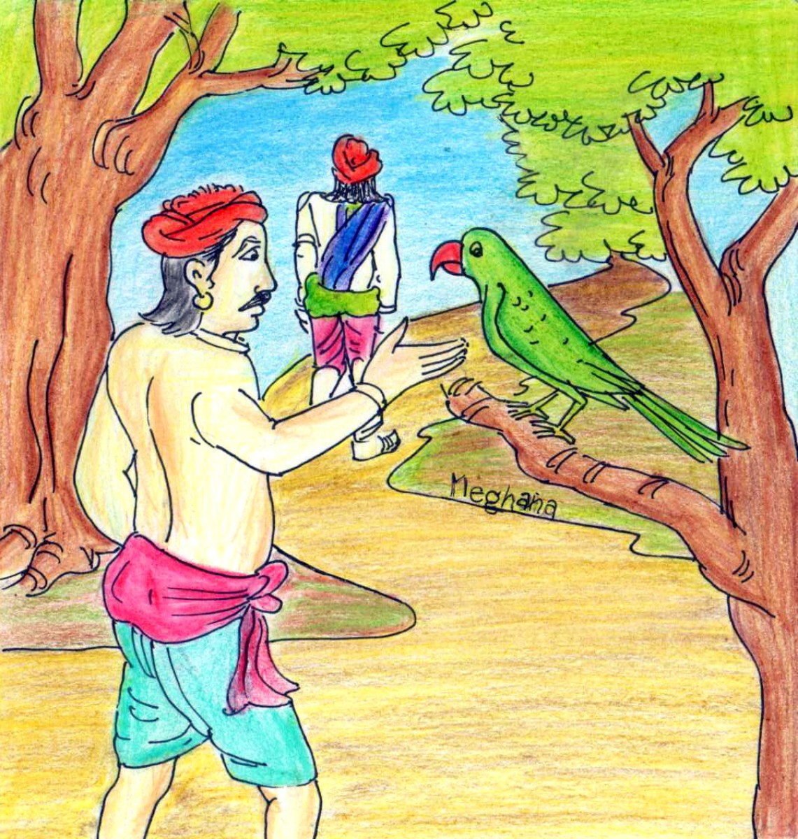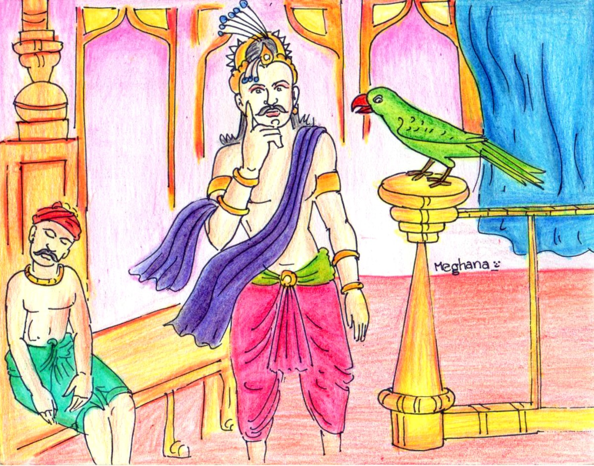 పురుషోత్తముడు లేచి నిలబడి చిలుకను అభినందిస్తూ, "నువ్వు చాలా తెలివైనదానివి. నిజంగానే నువ్వు అక్కడున్నావు కాబట్టి సరిపోయింది. లేకపోతే ఎంత ప్రమాదం అగును?! నీకు రాజనీతి కూడా బాగా తెలుసు.. నువ్వు నాతోబాటు ఉండరాదూ?" అన్నాడు.