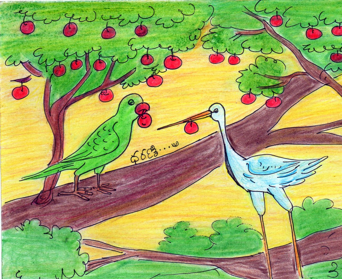 ఒక చిలుక, ఒక కొంగ మంచి స్నేహితులు. ఒక రోజున వాటికి రెండింటికీ బాగా ఆకలి వేసింది.