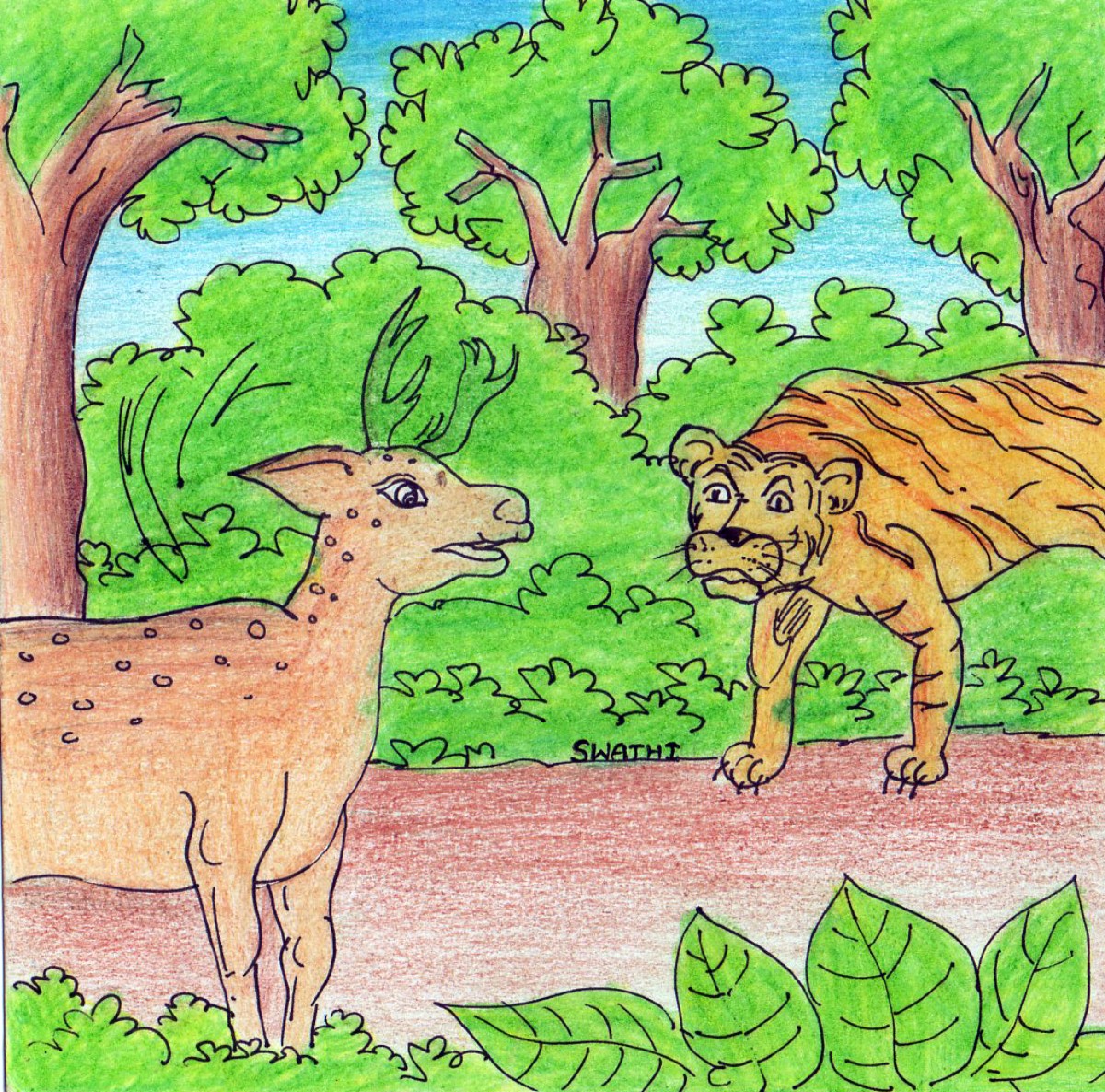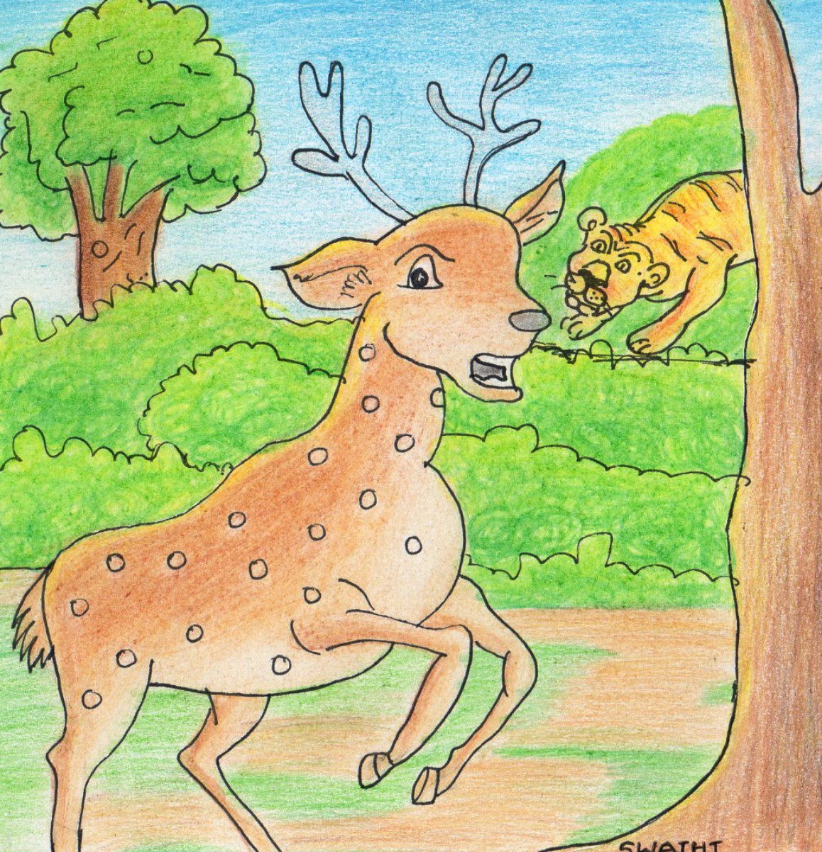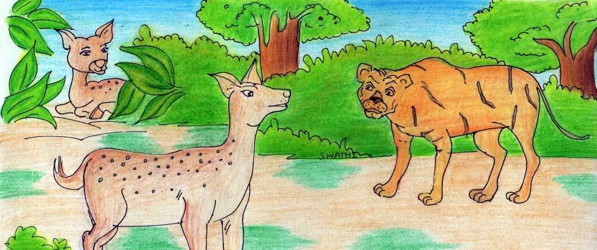 అడవిలో ఒంటరిగా వెళ్తున్న జింకను, అప్పుడే వేటకు వెళ్ళి వస్తున్న ఒక పులి చూసి, దాని వెంట పడింది.