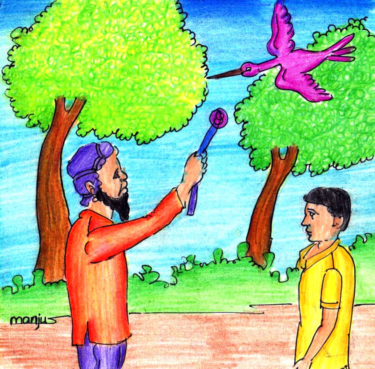 అయితే వాళ్లంతా అట్లా పోతుంటే ఒక పెద్ద పక్షి ఒకటి వాళ్ల మీద దాడి చేసింది. పెద్దాయన ఏదో మంత్రం చదివేసరికి అది కాస్తా మాయమైపోయింది. అందరూ ఆశ్చర్యపోయారు.