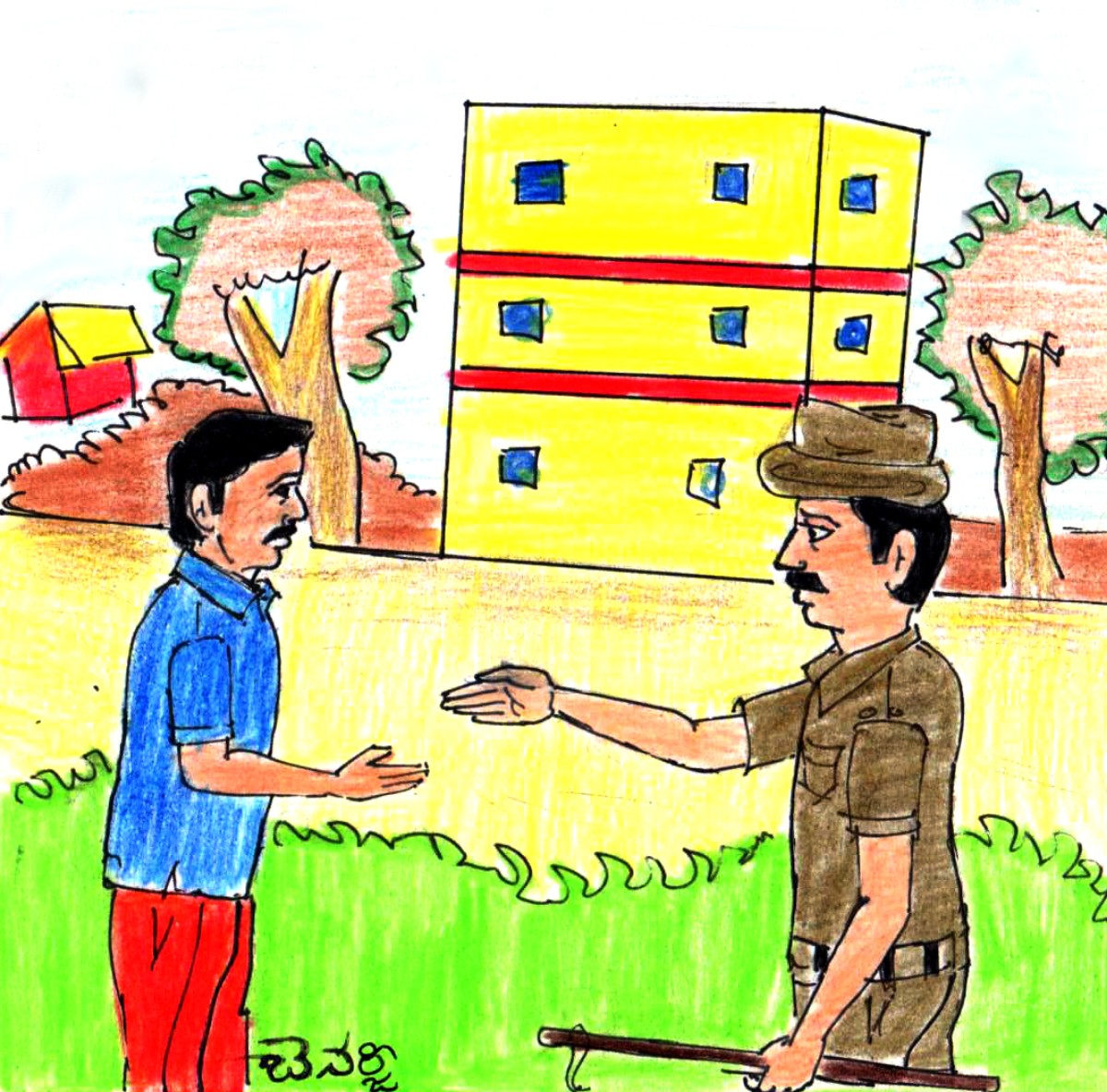 అంతలో అకస్మాత్తుగా ఒక పోలీసు అటువైపు వస్తూ కనిపించాడు. "ఏయ్! ఇక్కడ ఏం చేస్తున్నారు? ఏవీ, మీ పర్మిట్లు చూపించండి!" అని చెయ్యి చాచాడు పోలీసు, దూరం నుండే.